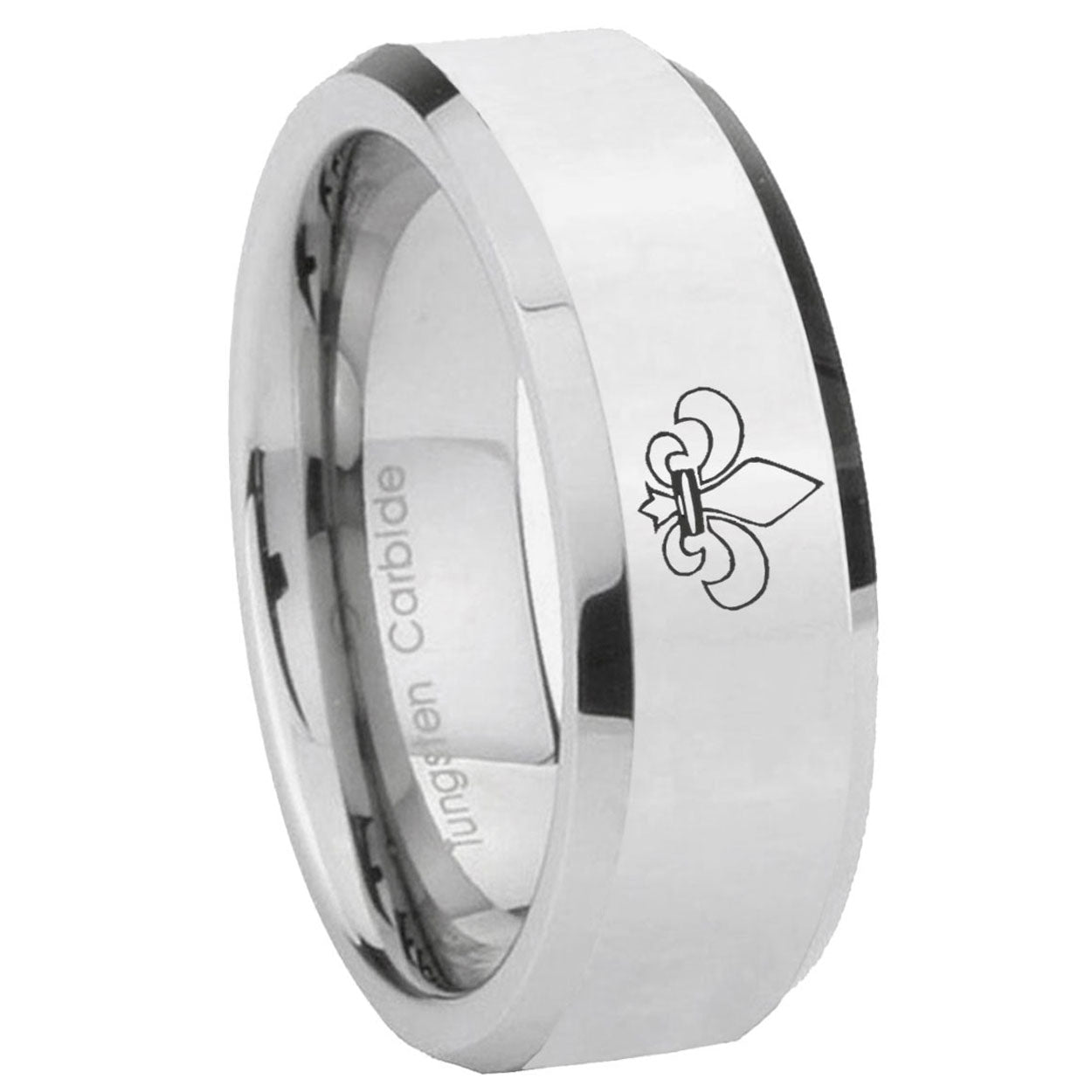 Intruding 5, 8mm Fleur-De-Lis Beveled Edges Silver Tungsten Wedding Engagement Ring . Offer in both 5mm and 8mm band width polished silver finished from size 4 to 14