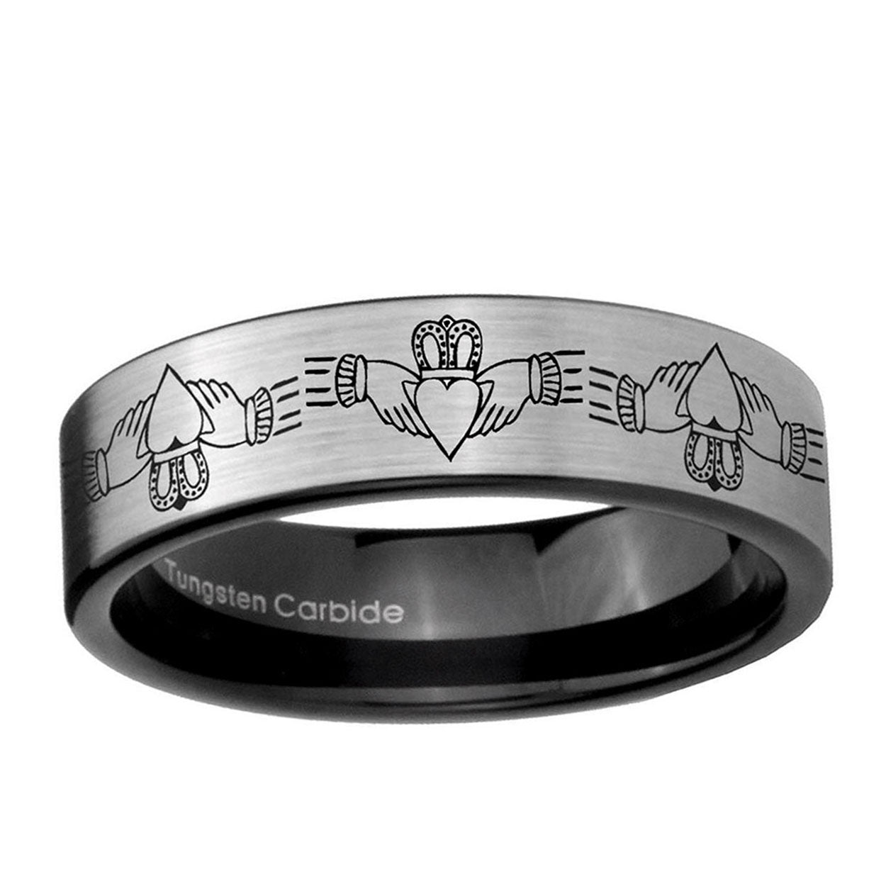 Intruding 6, 8mm Irish Claddagh Pipe Cut Brushed Silver Tungsten Carbide Bands Ring . Offer in both 6mm and 8mm band width brushed silver and black plated finished from size 5 to 14