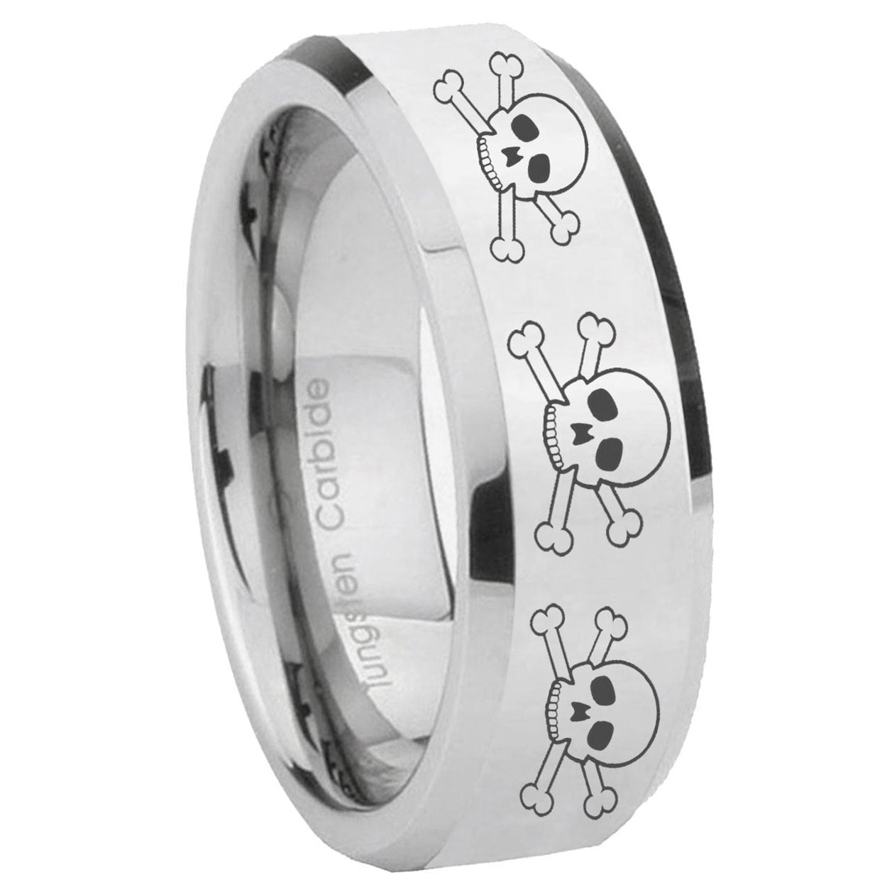 Intruding 5, 8mm Multiple Skull Beveled Edges Silver Tungsten Carbide Wedding Engraving Ring . Offer in both 5mm and 8mm band width polished silver finished from size 4 to 14