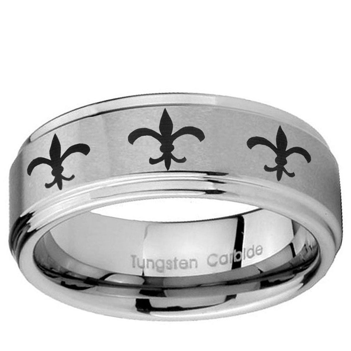 Intruding 5, 8mm Multiple Fleur-De-Lis Step Edges Brushed Silver Tungsten Men's Wedding Ring . Offer in both 5mm and 8mm band width brushed grey finished from size 4 to 14
