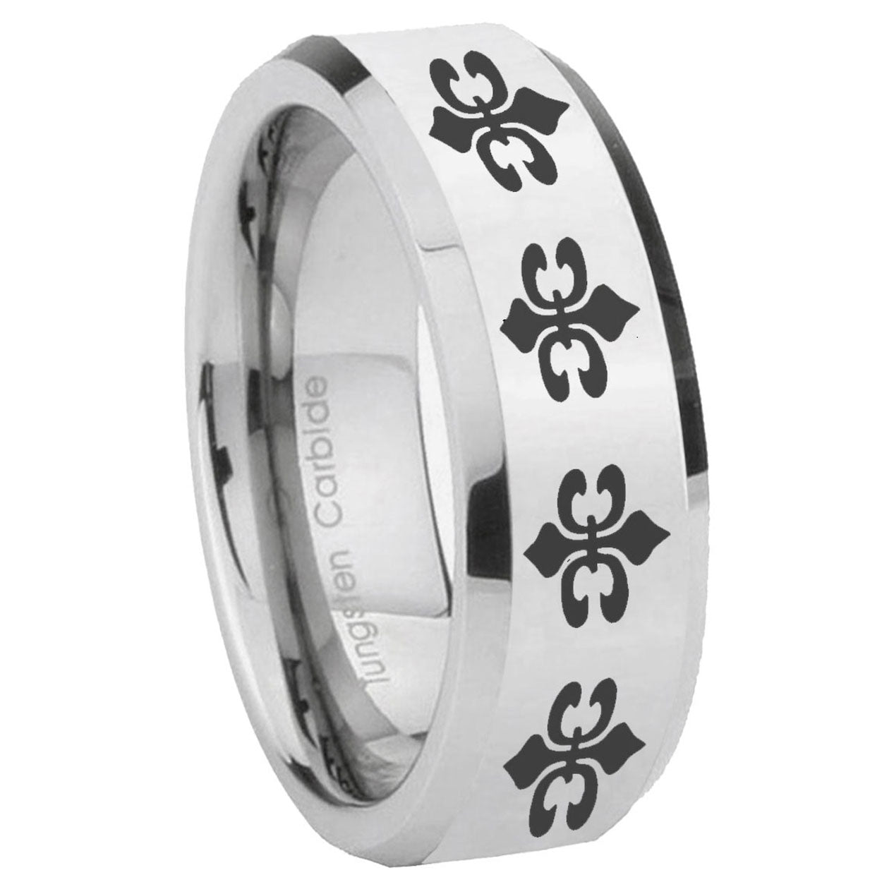 Intruding 5, 8mm Multiple Fleur-De-Lis Beveled Edges Silver Tungsten Mens Wedding Ring . Offer in both 5mm and 8mm band width polished silver finished from size 4 to 14