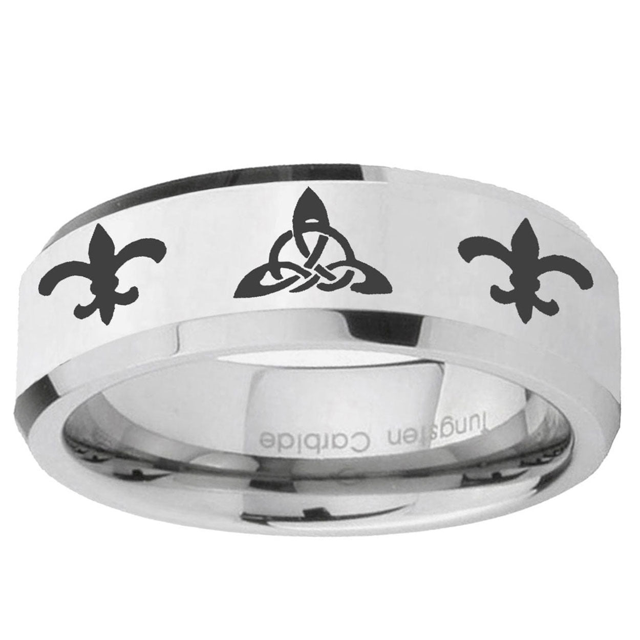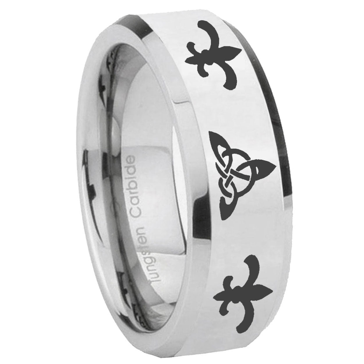 Intruding 5, 8mm Celtic Triangle Fleur-De-Lis Beveled Edges Silver Tungsten Men's Bands Ring . Offer in both 5mm and 8mm band width polished silver finished from size 4 to 14