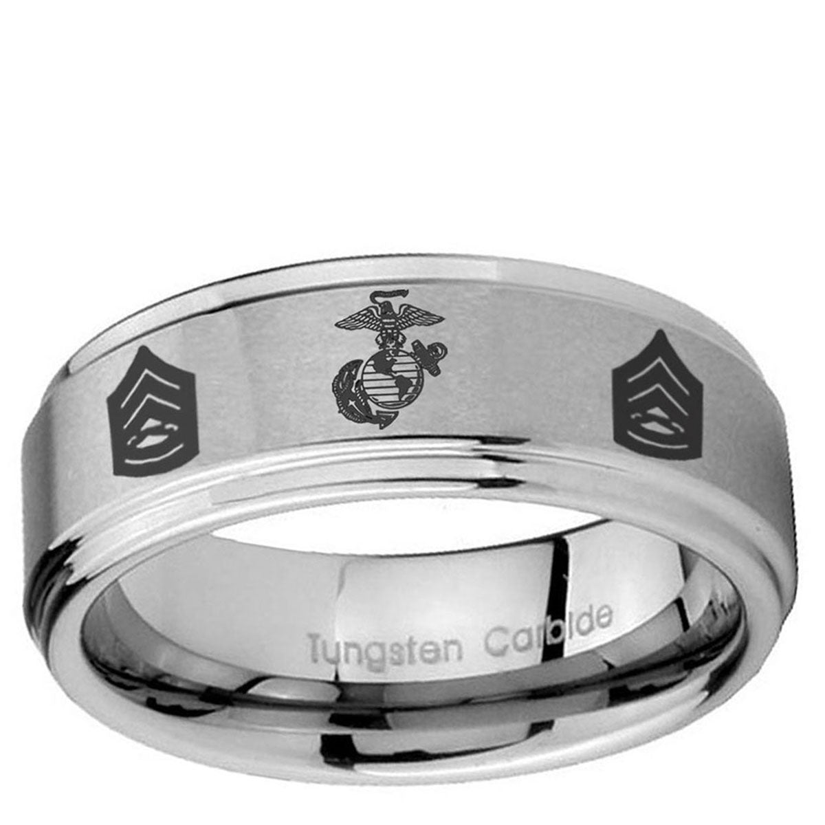 Intruding 5, 8mm Marine Army Sergeant Step Edges Brushed Silver Tungsten Carbide Men's Band Ring . Offer in both 5mm and 8mm band width brushed grey finished from size 4 to 14