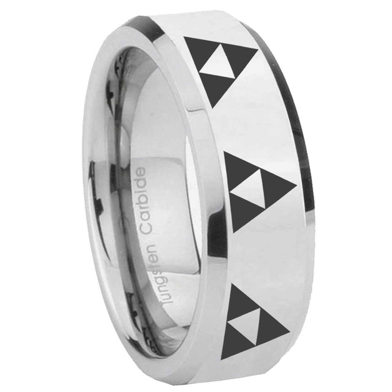 Intruding 5, 8mm Multiple Zelda Triforce Beveled Edges Silver Tungsten Carbide Mens Ring . Offer in both 5mm and 8mm band width polished silver finished from size 4 to 14