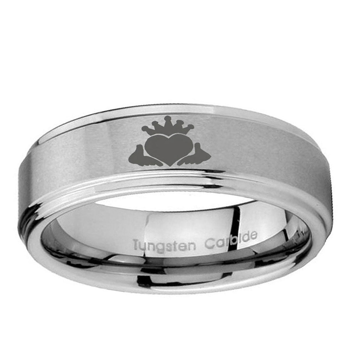 Intruding 5, 8mm Claddagh Design Step Edges Brushed Silver Tungsten Carbide Men's Ring Engraved . Offer in both 5mm and 8mm band width brushed grey finished from size 4 to 14