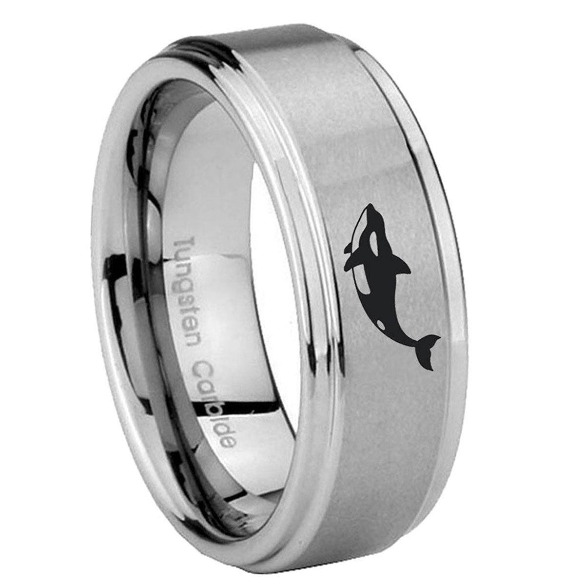 Intruding 5, 8mm Keller Whale Step Edges Brushed Silver Tungsten Carbide Men's Wedding Band . Offer in both 5mm and 8mm band width brushed grey finished from size 4 to 14