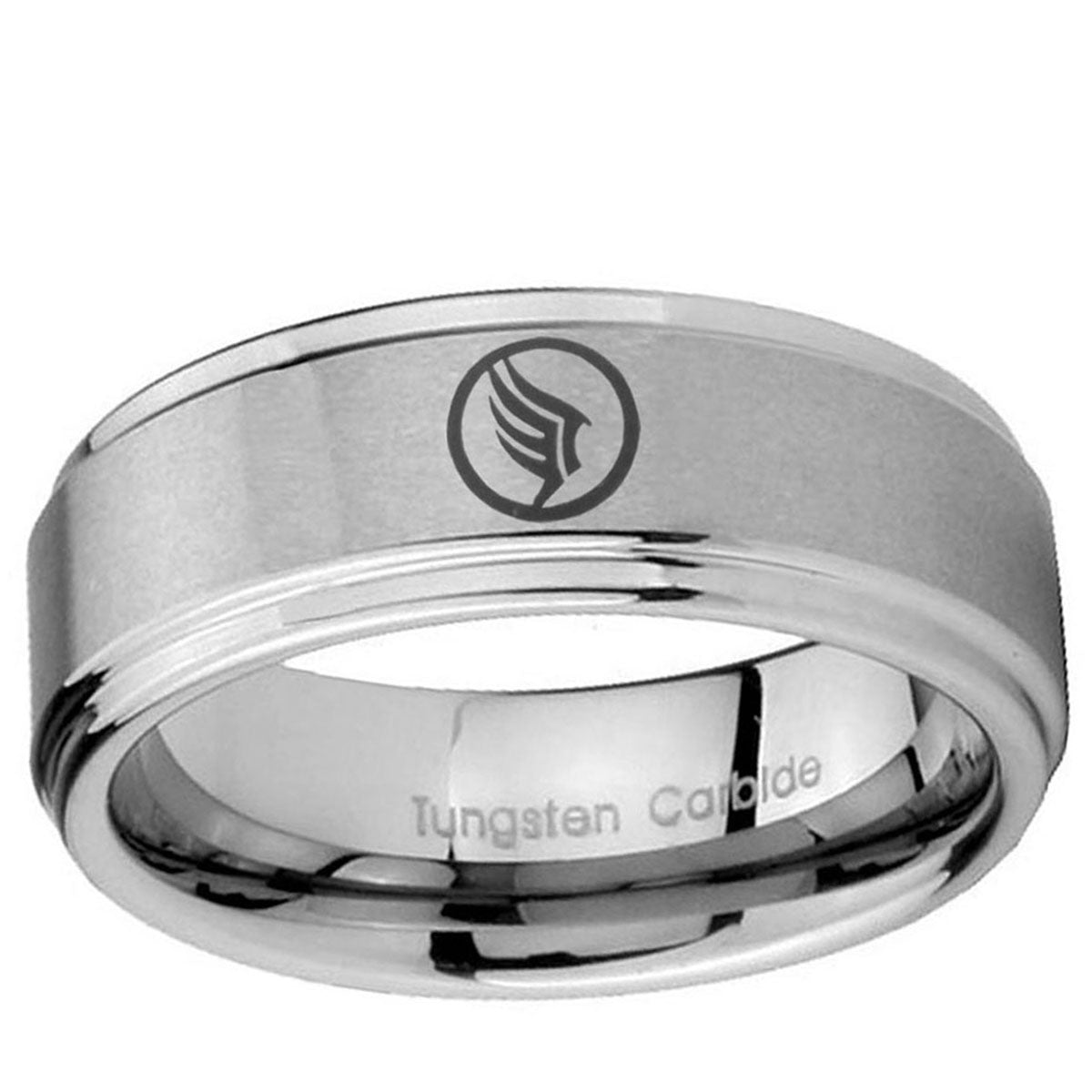 Intruding 5, 8mm Mass Effect Step Edges Silver Tungsten Carbide Laser Engraved Ring . Offer in both 5mm and 8mm band width brushed grey finished from size 4 to 14