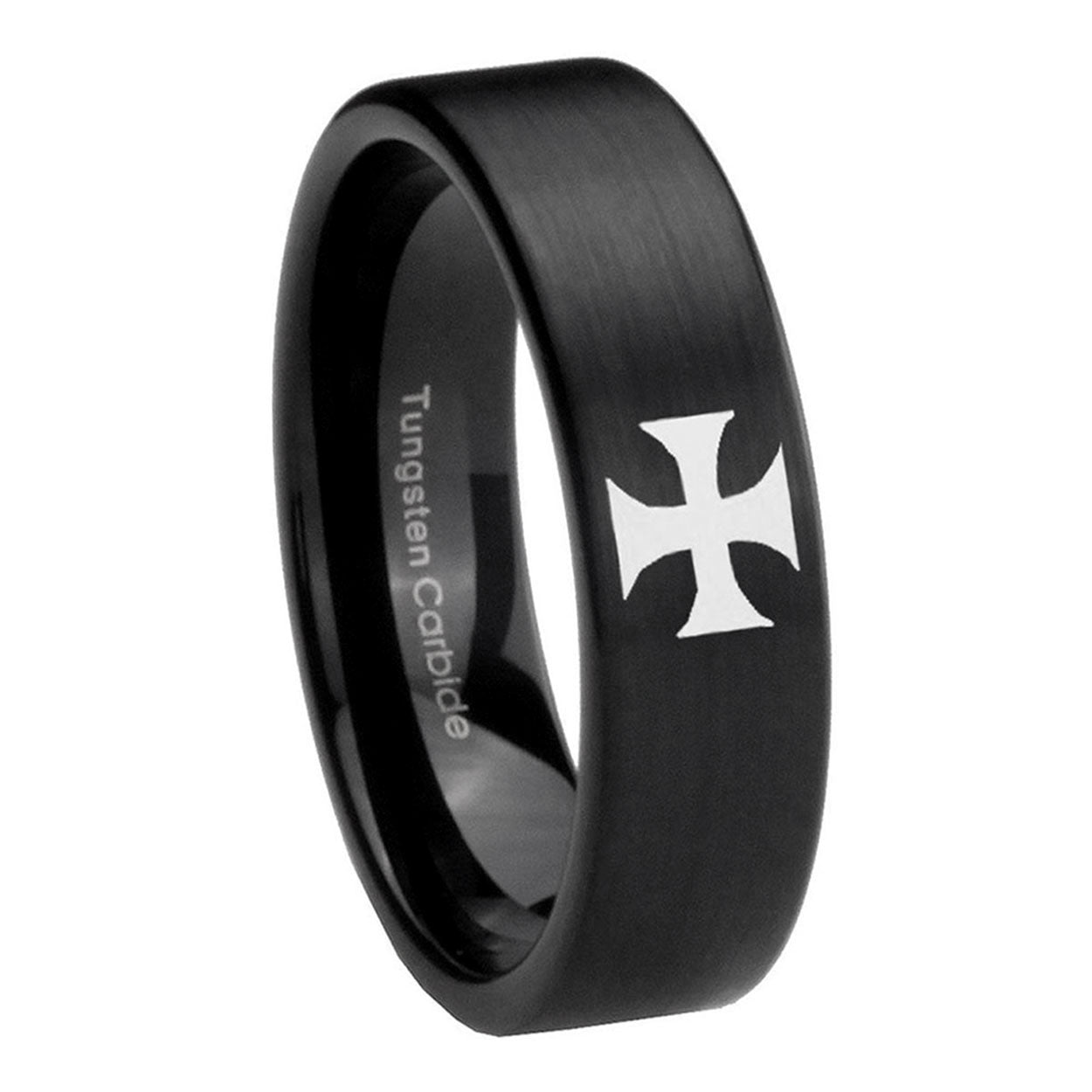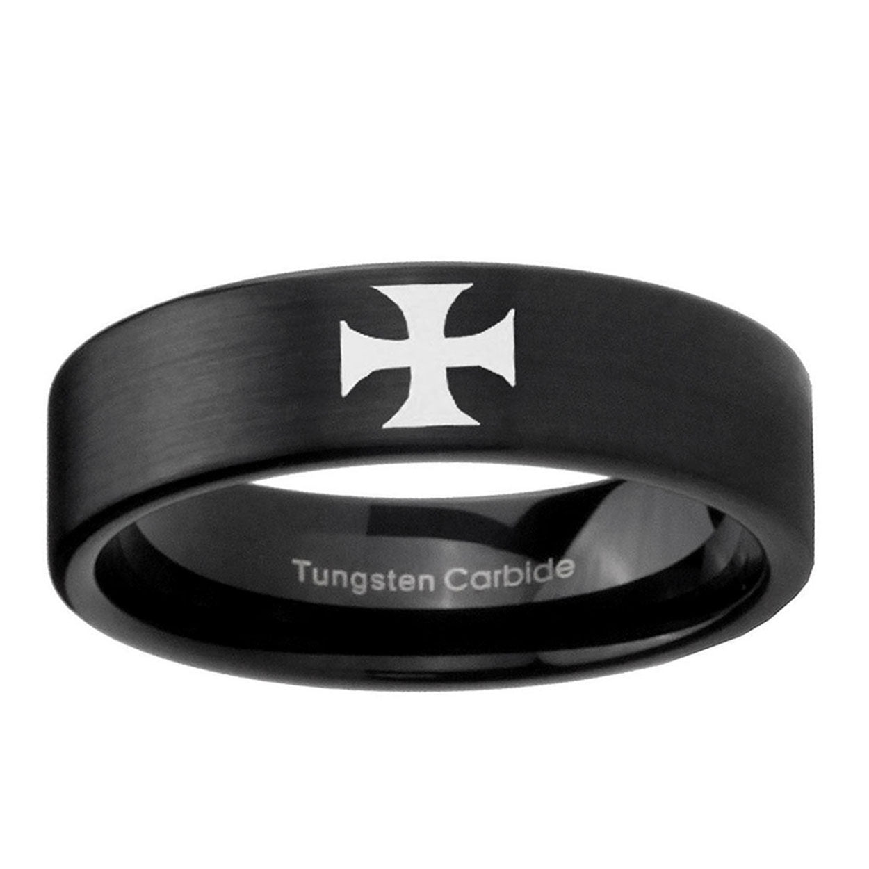 Intruding 6, 8mm Maltese Cross Pipe Cut Brush Black Tungsten Carbide Engagement Ring . Offer in both 6mm and 8mm band width brushed black plated finished from size 5 to 14