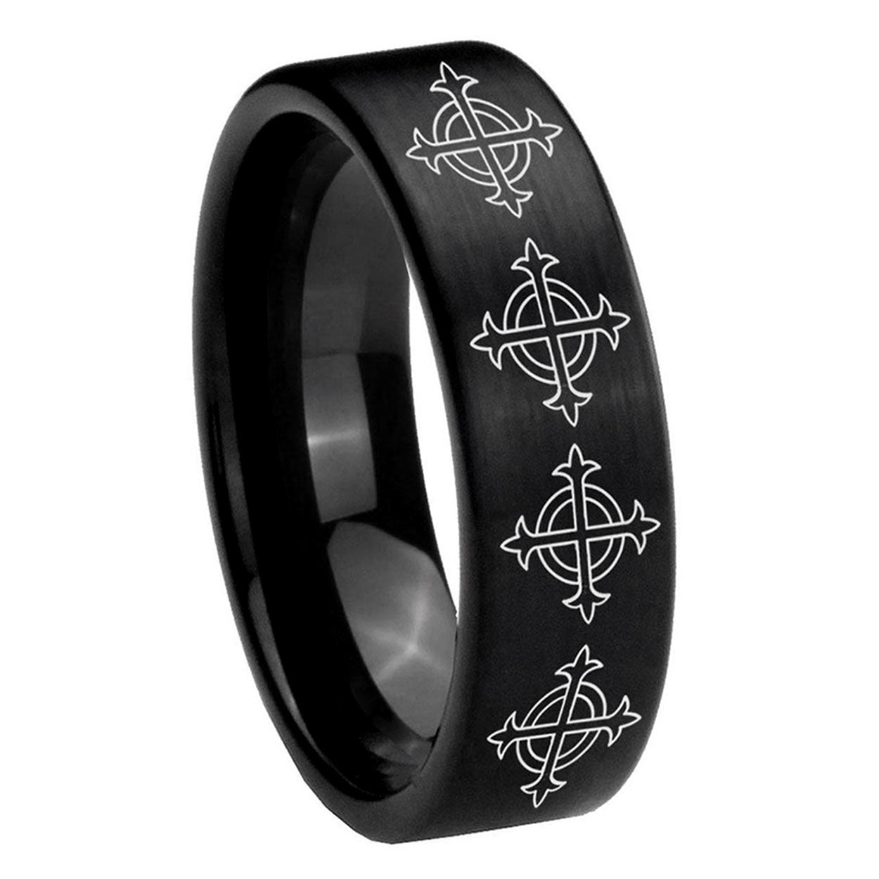 Intruding 6, 8mm Multiple Crosses Pipe Cut Brush Black Tungsten Carbide Mens Ring . Offer in both 6mm and 8mm band width brushed black plated finished from size 5 to 14