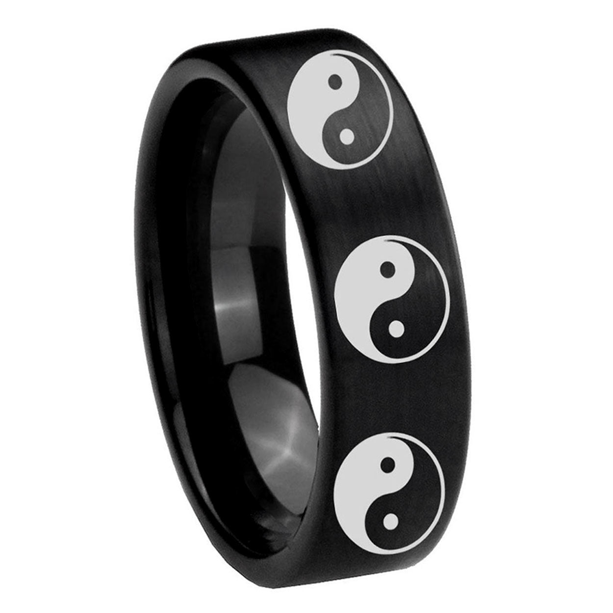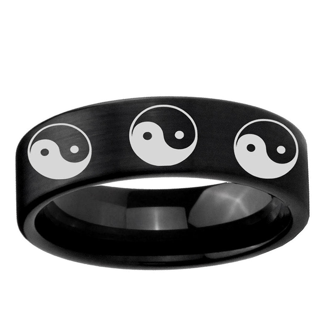 Intruding 6, 8mm Multiple Yin Yang Pipe Cut Brush Black Tungsten Carbide Men's Wedding Band . Offer in both 6mm and 8mm band width brushed black plated finished from size 5 to 14