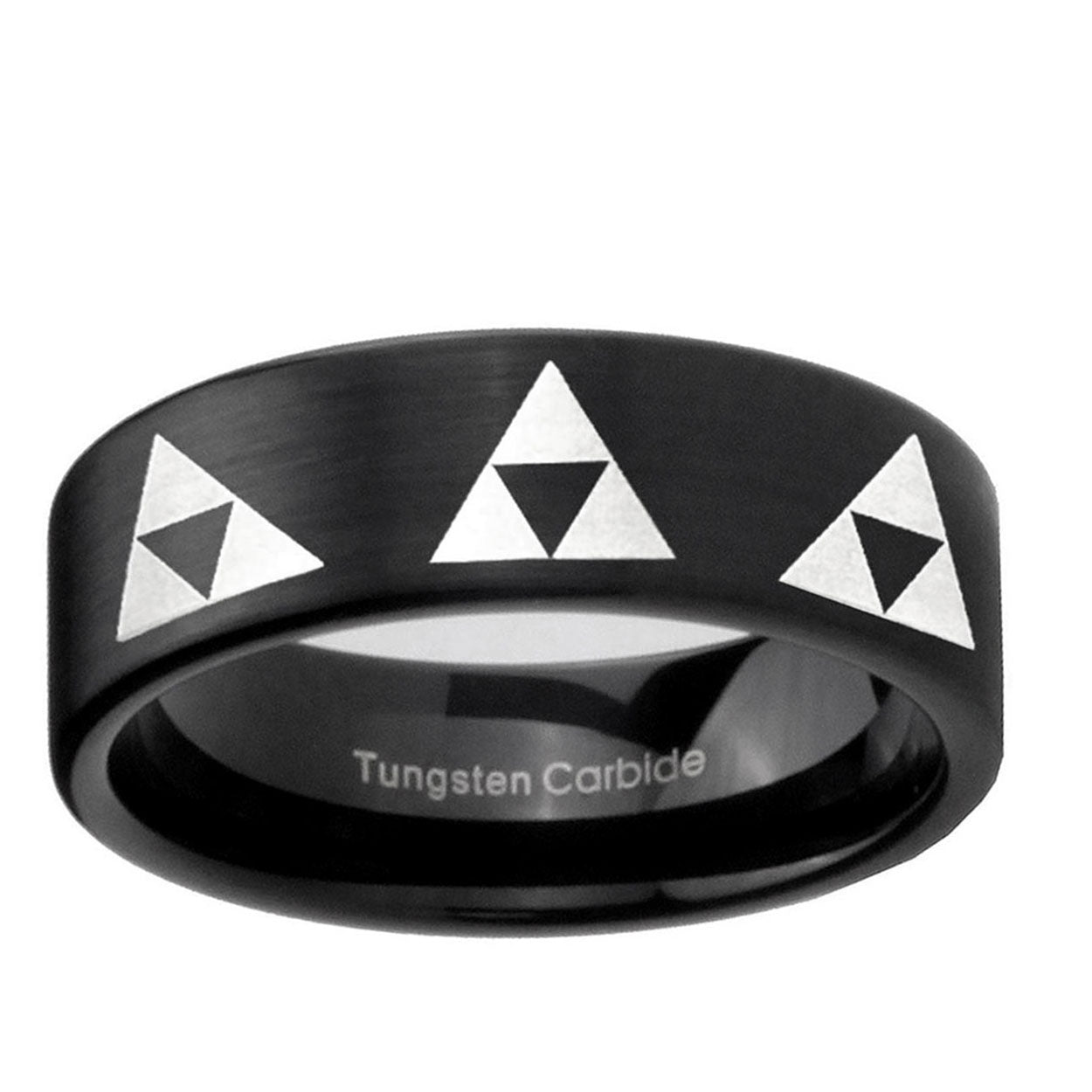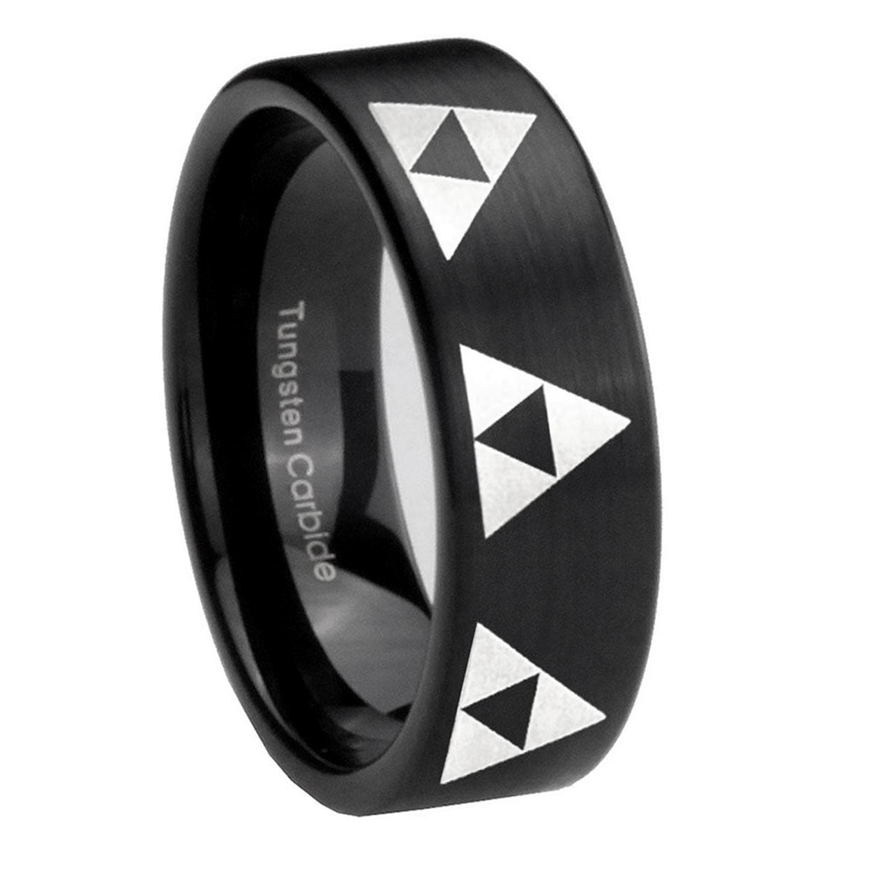 Intruding 6, 8mm Multiple Zelda Triforce Pipe Cut Brush Black Tungsten Wedding Engraving Ring . Offer in both 6mm and 8mm band width brushed black plated finished from size 5 to 14
