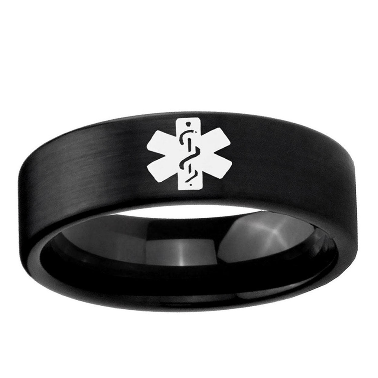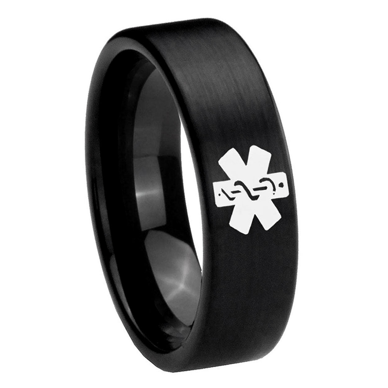 Intruding 6, 8mm Medical Alert Pipe Cut Brush Black Tungsten Carbide Mens Engagement Ring . Offer in both 6mm and 8mm band width brushed black plated finished from size 5 to 14