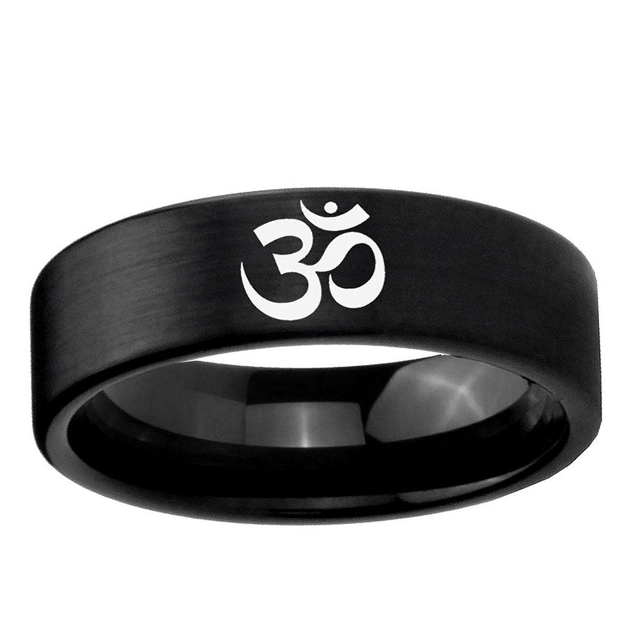 Intruding 6, 8mm Om Aum Yoga Pipe Cut Brush Black Tungsten Carbide Men's Bands Ring . Offer in both 6mm and 8mm band width brushed black plated finished from size 5 to 14