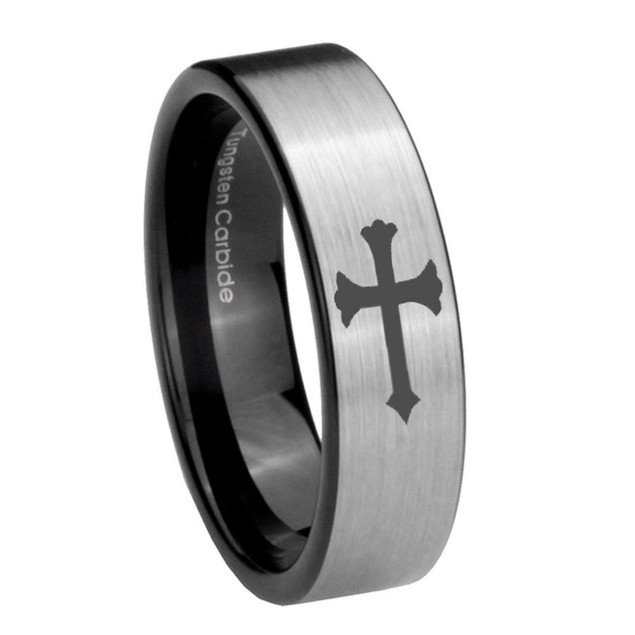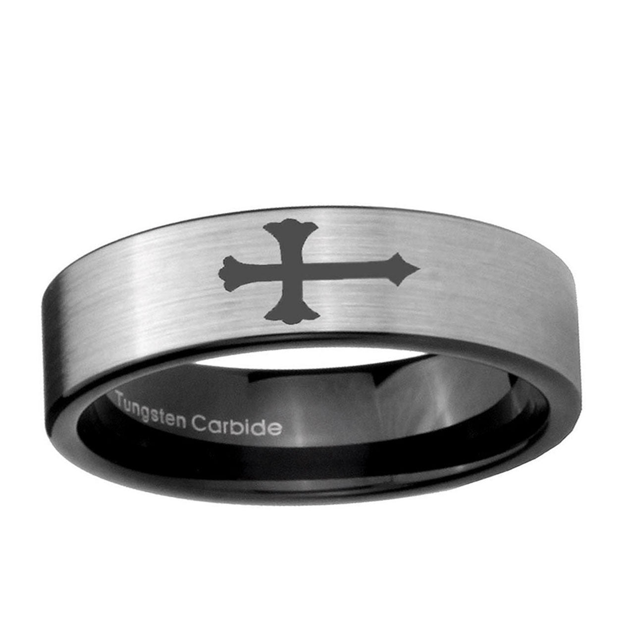 Intruding 6, 8mm Christian Cross Pipe Cut Brushed Silver Tungsten Carbide Men's Ring . Offer in both 6mm and 8mm band width brushed silver and black plated finished from size 5 to 14