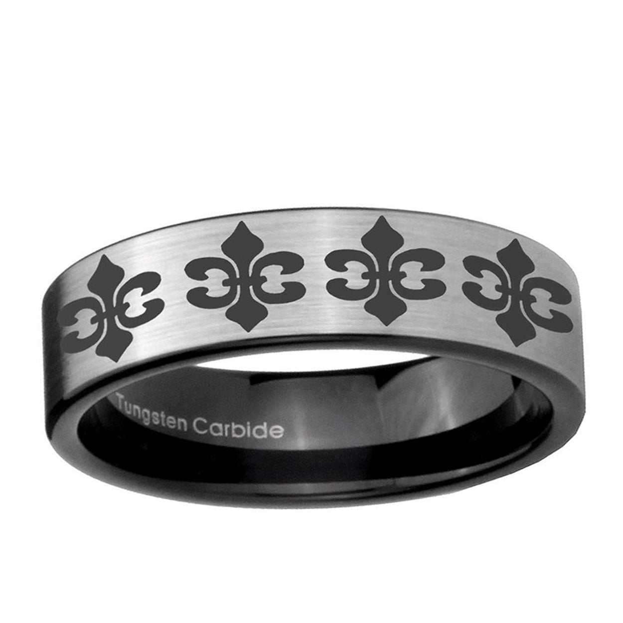 Intruding 6, 8mm Multiple Fleur-De-Lis Pipe Cut Brushed Silver Tungsten Wedding Band Mens . Offer in both 6mm and 8mm band width brushed silver and black plated finished from size 5 to 14