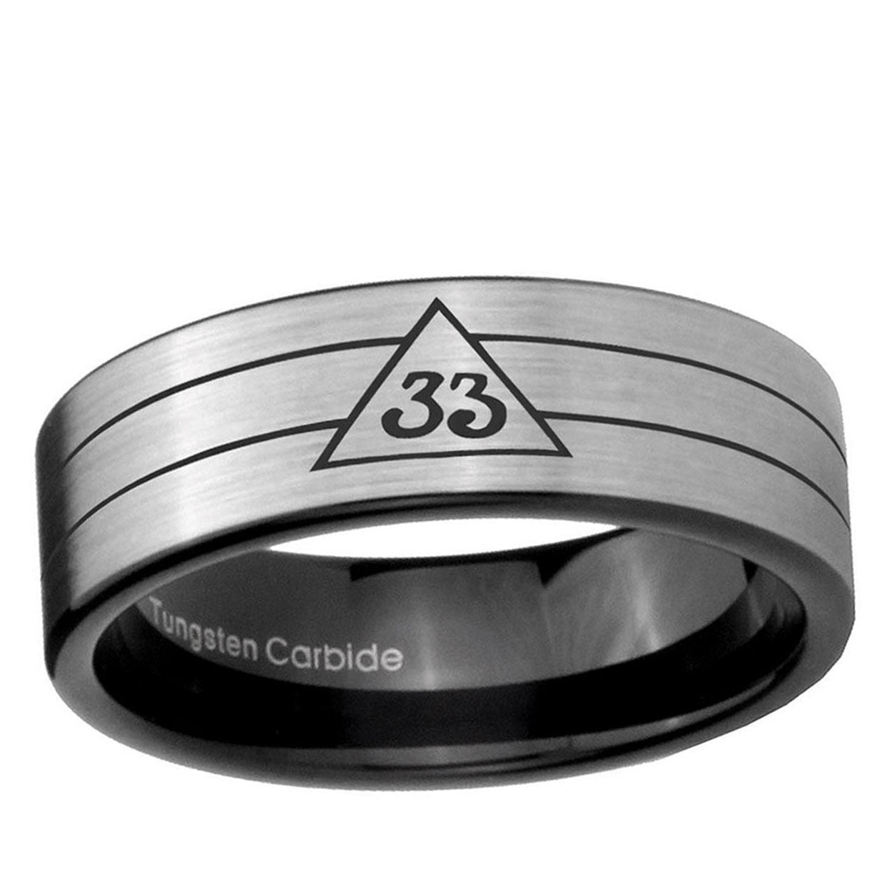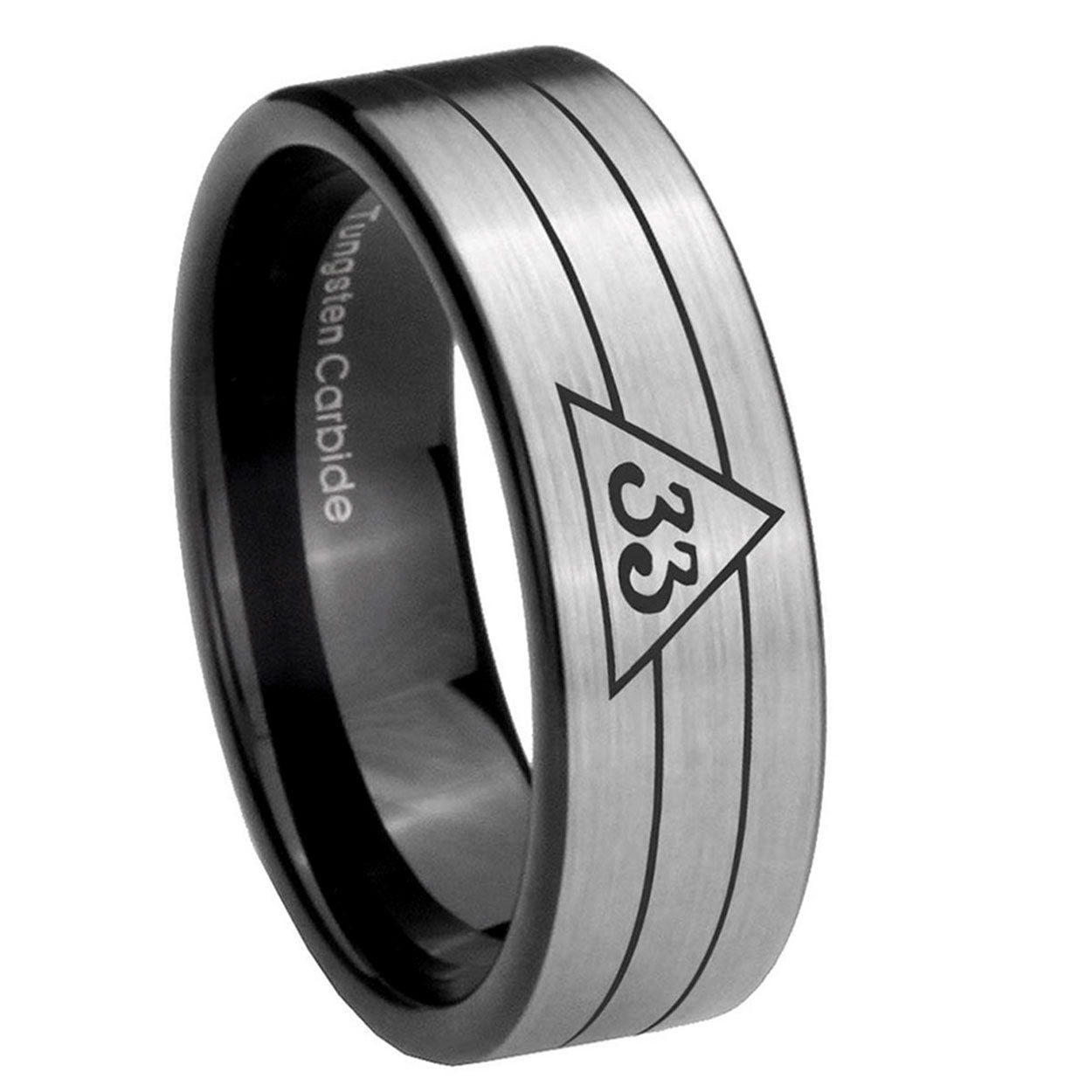 Intruding 6, 8mm Masonic 32 Duo Line Freemason Pipe Cut Brushed Silver Tungsten Carbide Men's Engagement Ring . Offer in both 6mm and 8mm band width brushed silver and black plated finished from size 5 to 14