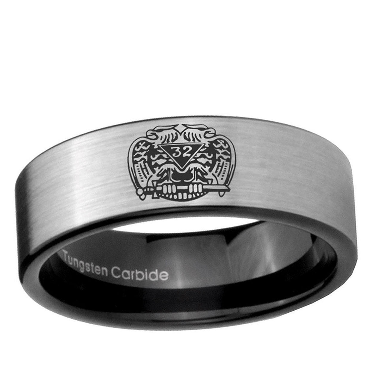 Intruding 6, 8mm Masonic 32 Degree Freemason Pipe Cut Brushed Silver Tungsten Carbide Men's Engagement Ring . Offer in both 6mm and 8mm band width brushed silver and black plated finished from size 5 to 14