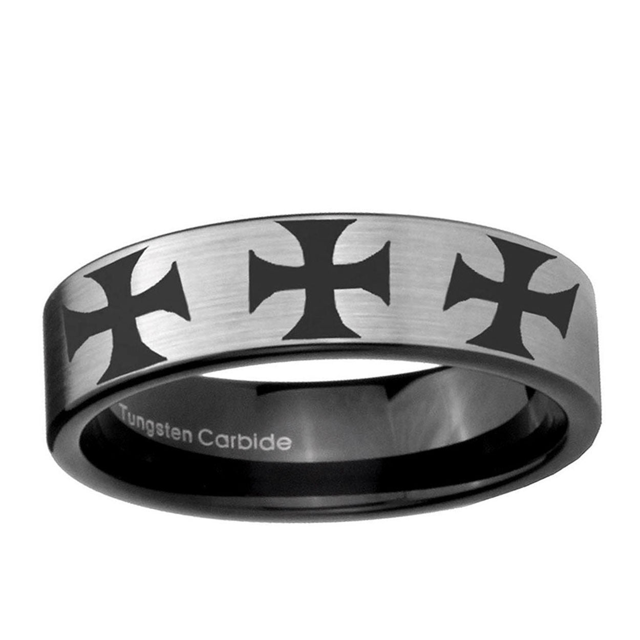 Intruding 6, 8mm Multiple Maltese Cross Pipe Cut Brushed Silver Tungsten Mens Wedding Band . Offer in both 6mm and 8mm band width brushed silver and black plated finished from size 5 to 14