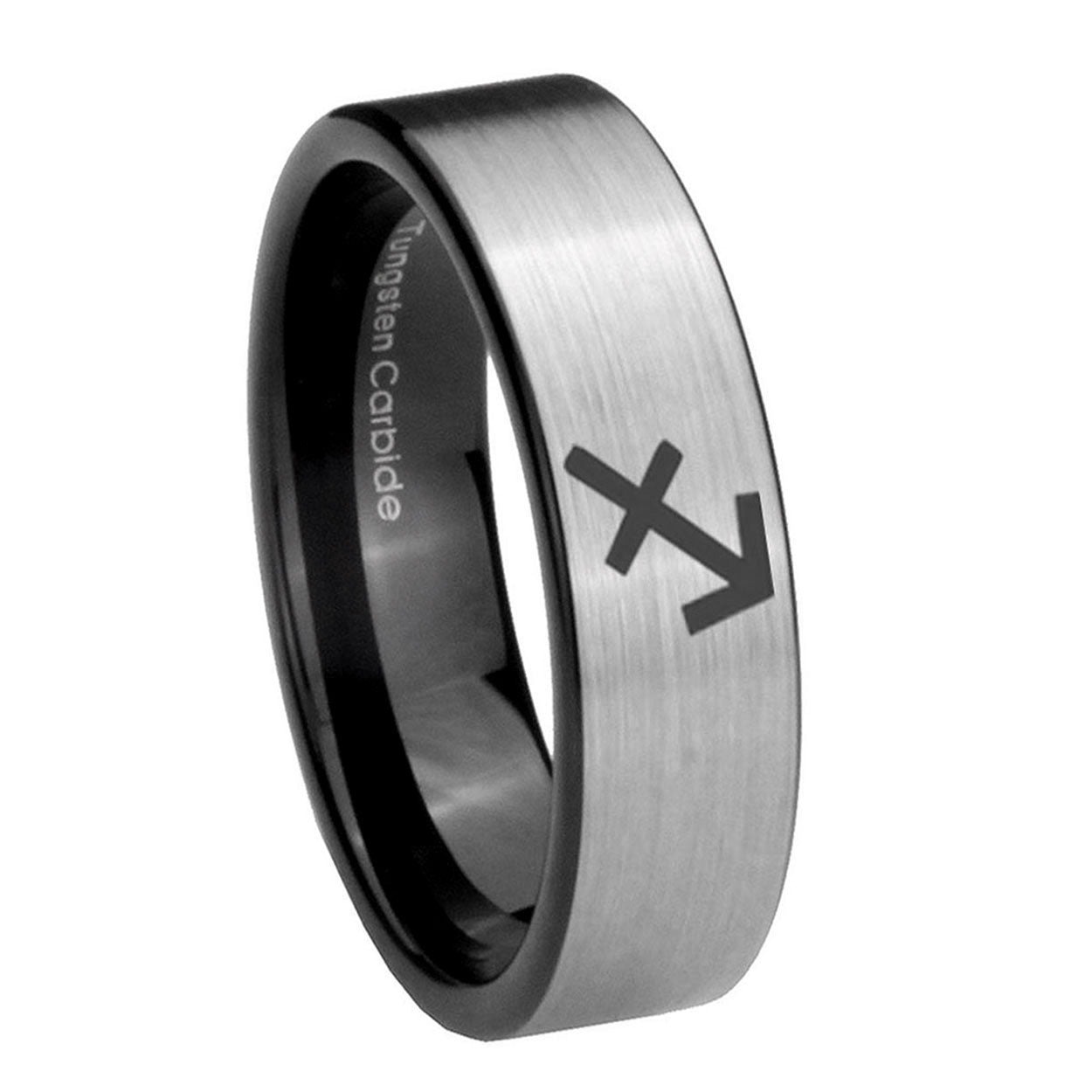 Intruding 6, 8mm Sagittarius Zodiac Pipe Cut Brushed Silver Tungsten Personalized Ring . Offer in both 6mm and 8mm band width brushed silver and black plated finished from size 5 to 14