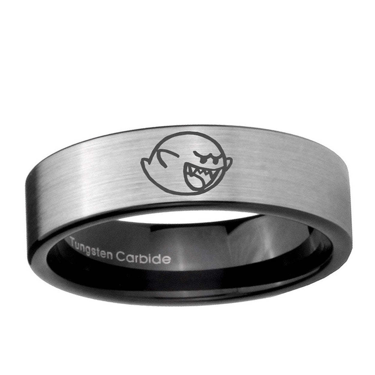 Intruding 6, 8mm Mario Boo Ghost Pipe Cut Brushed Silver Tungsten Carbide Wedding Bands Ring . Offer in both 6mm and 8mm band width brushed silver and black plated finished from size 5 to 14