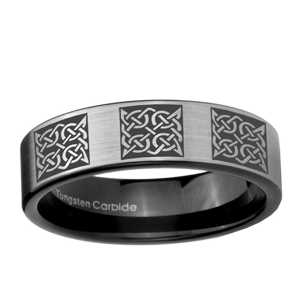 Intruding 6, 8mm Multiple Celtic Pipe Cut Brushed Silver Tungsten Carbide Engagement Ring . Offer in both 6mm and 8mm band width brushed silver and black plated finished from size 5 to 14