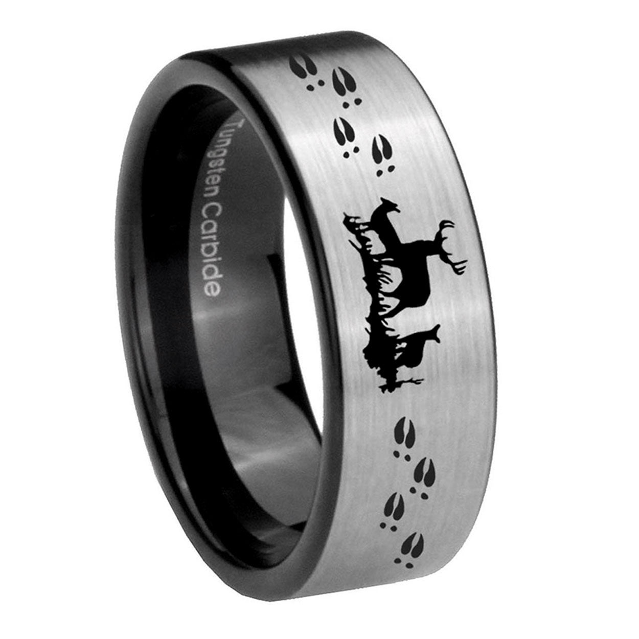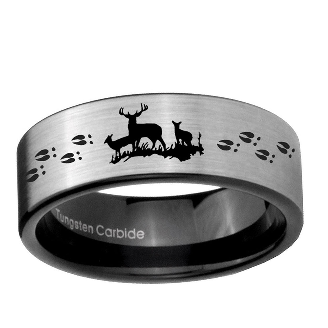 Intruding 6, 8mm Deer Hunting Pipe Cut Brushed Silver Tungsten Custom Ring for Men . Offer in both 6mm and 8mm band width brushed silver and black plated finished from size 5 to 14