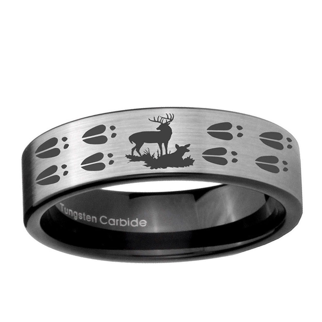 Intruding 6, 8mm Deer Hunting Tracks Pipe Cut Brushed Silver Tungsten Men's Bands Ring . Offer in both 6mm and 8mm band width brushed silver and black plated finished from size 5 to 14