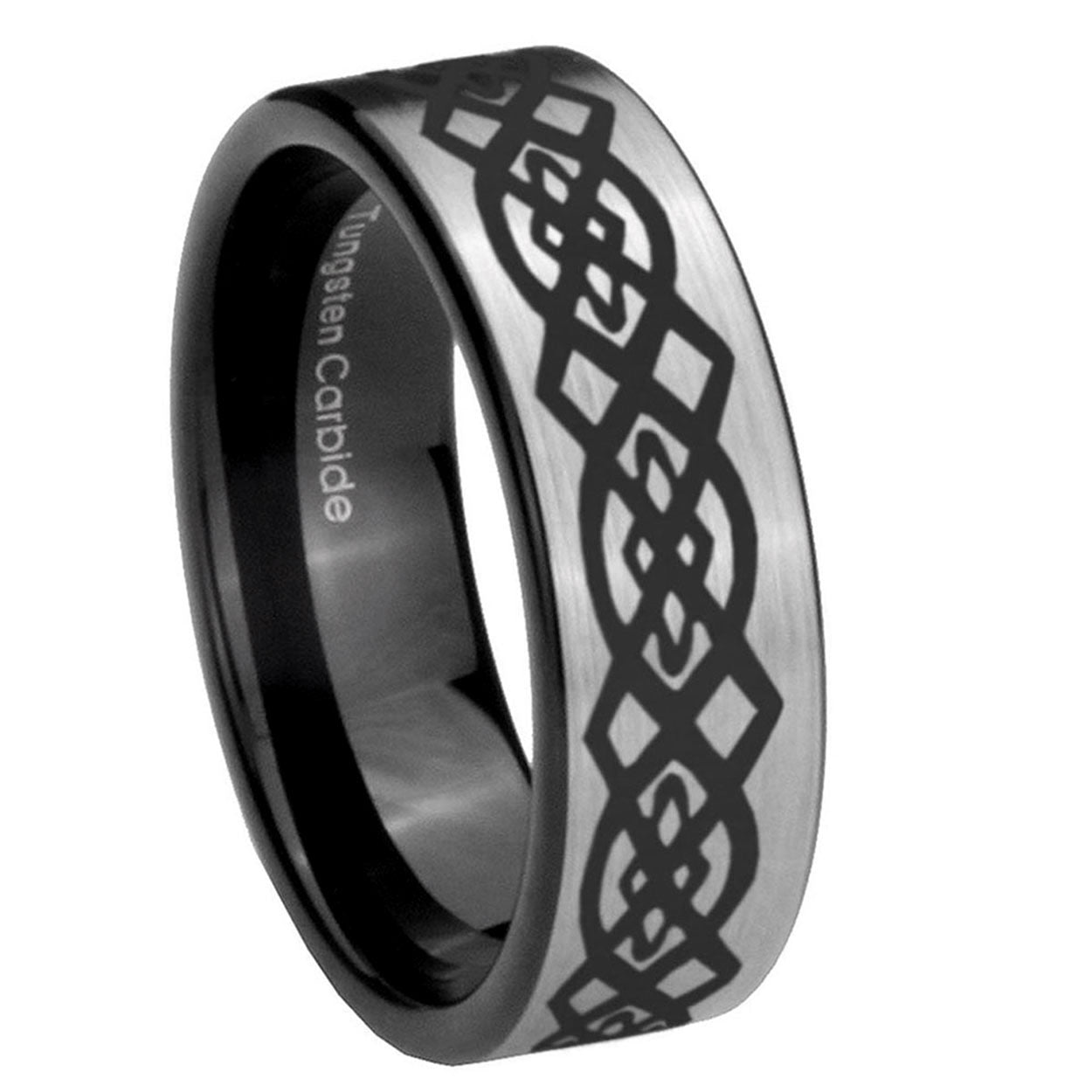 Intruding 6, 8mm Celtic Knot Pipe Cut Brushed Silver Tungsten Carbide Promise Ring . Offer in both 6mm and 8mm band width brushed silver and black plated finished from size 5 to 14