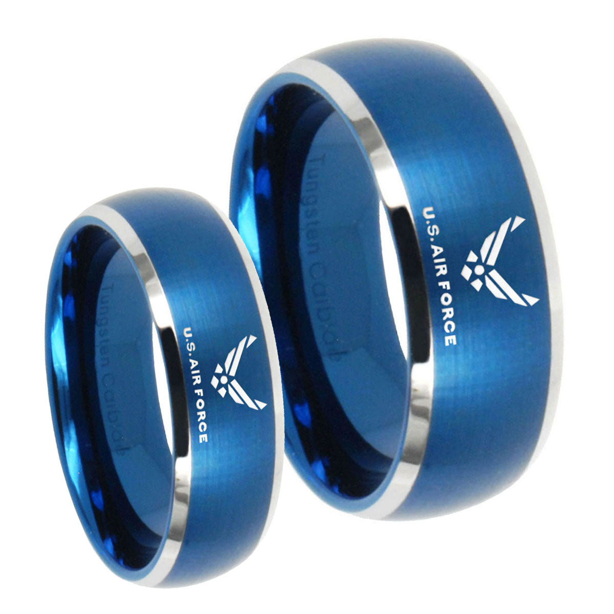 His Her Satin Blue Dome US Air Force Two Tone Tungsten Wedding Rings Set