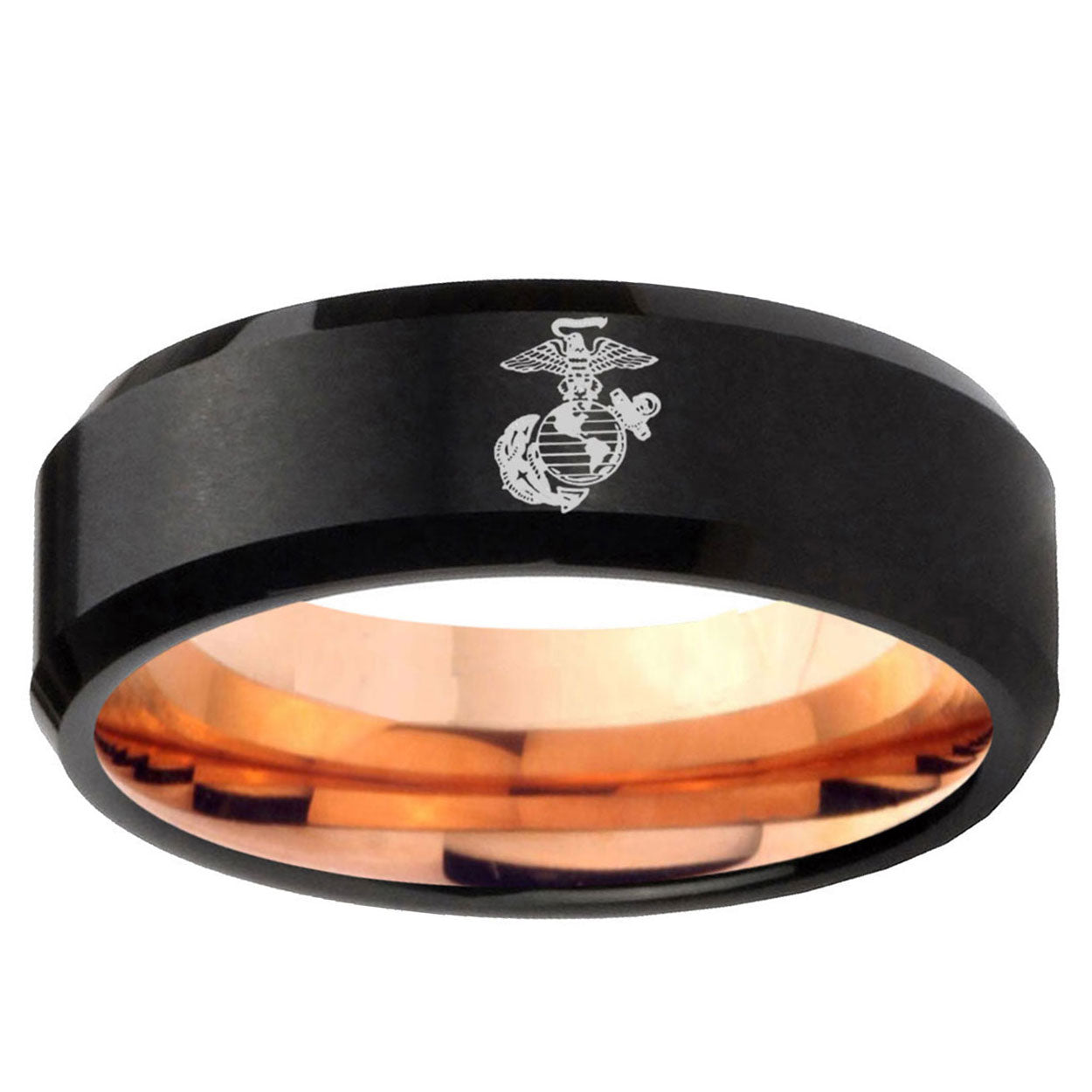 Intruding 5, 8mm Marine Beveled Edge Rose Gold and Black Tungsten Carbide Wedding Band Ring . Offer in both 5mm and 8mm band width Rose Gold and Black finished from Size 4 to 14