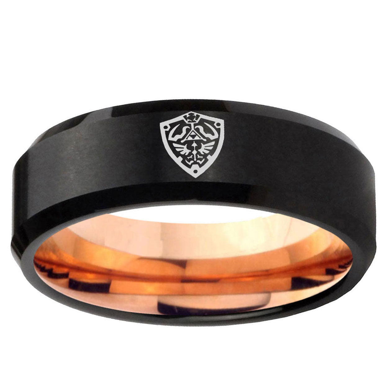 Intruding 5, 8mm Zelda Hylian Shield Beveled Edge Rose Gold and Black Tungsten Rings for Men . Offer in both 5mm and 8mm band width Rose Gold and Black finished from Size 4 to 14