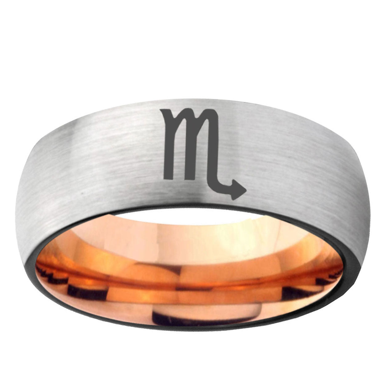 Intruding 6, 8mm Scorpio Horoscope Dome Gray And Rose Gold Tungsten Carbide Mens Bands Ring . Offer in both 6mm and 8mm band width gray and rose gold plated finished from size 5 to 14