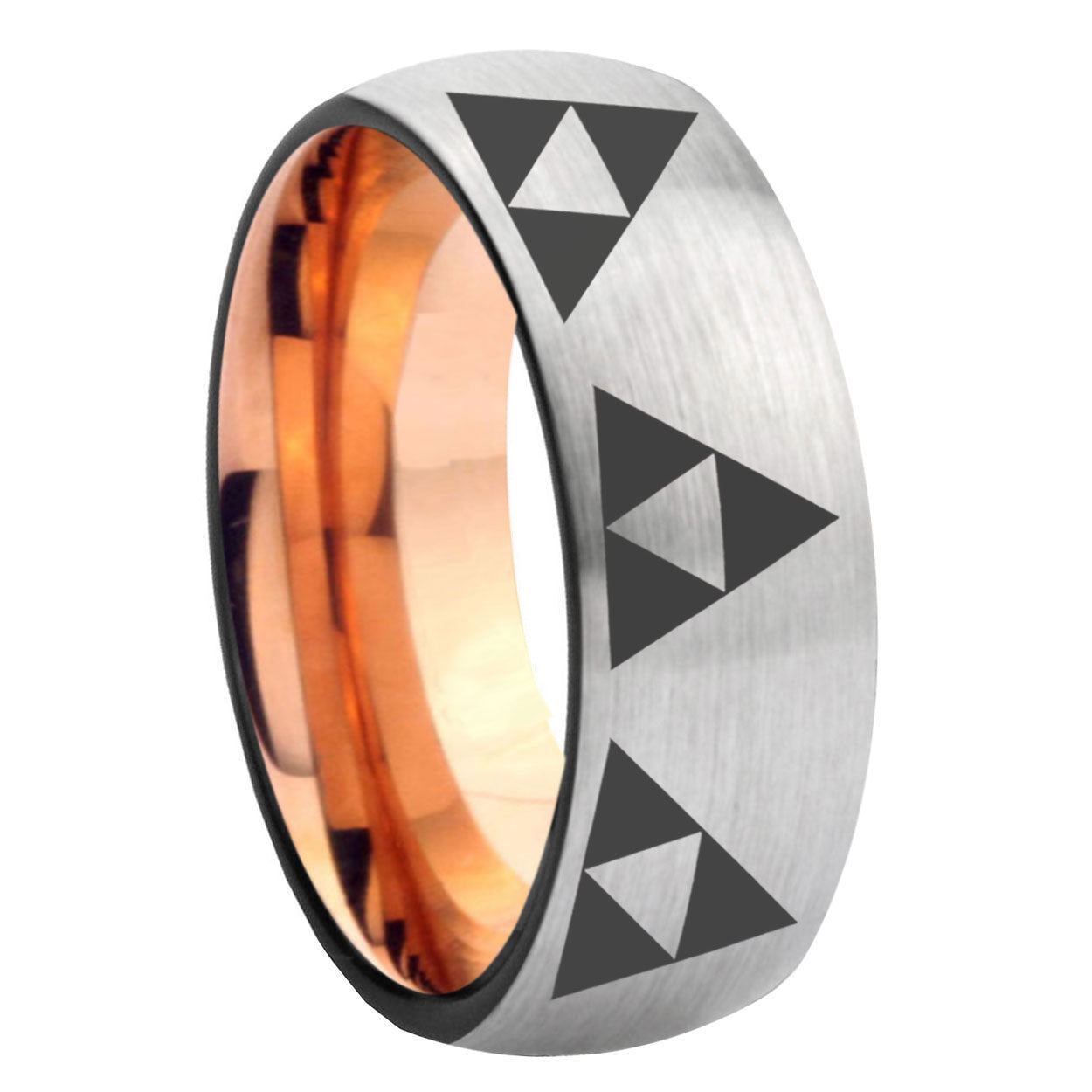 Intruding 6, 8mm Multiple Zelda Triforce Dome Gray And Rose Gold Tungsten Carbide Wedding Engraving Ring . Offer in both 6mm and 8mm band width gray and rose gold plated finished from size 5 to 14
