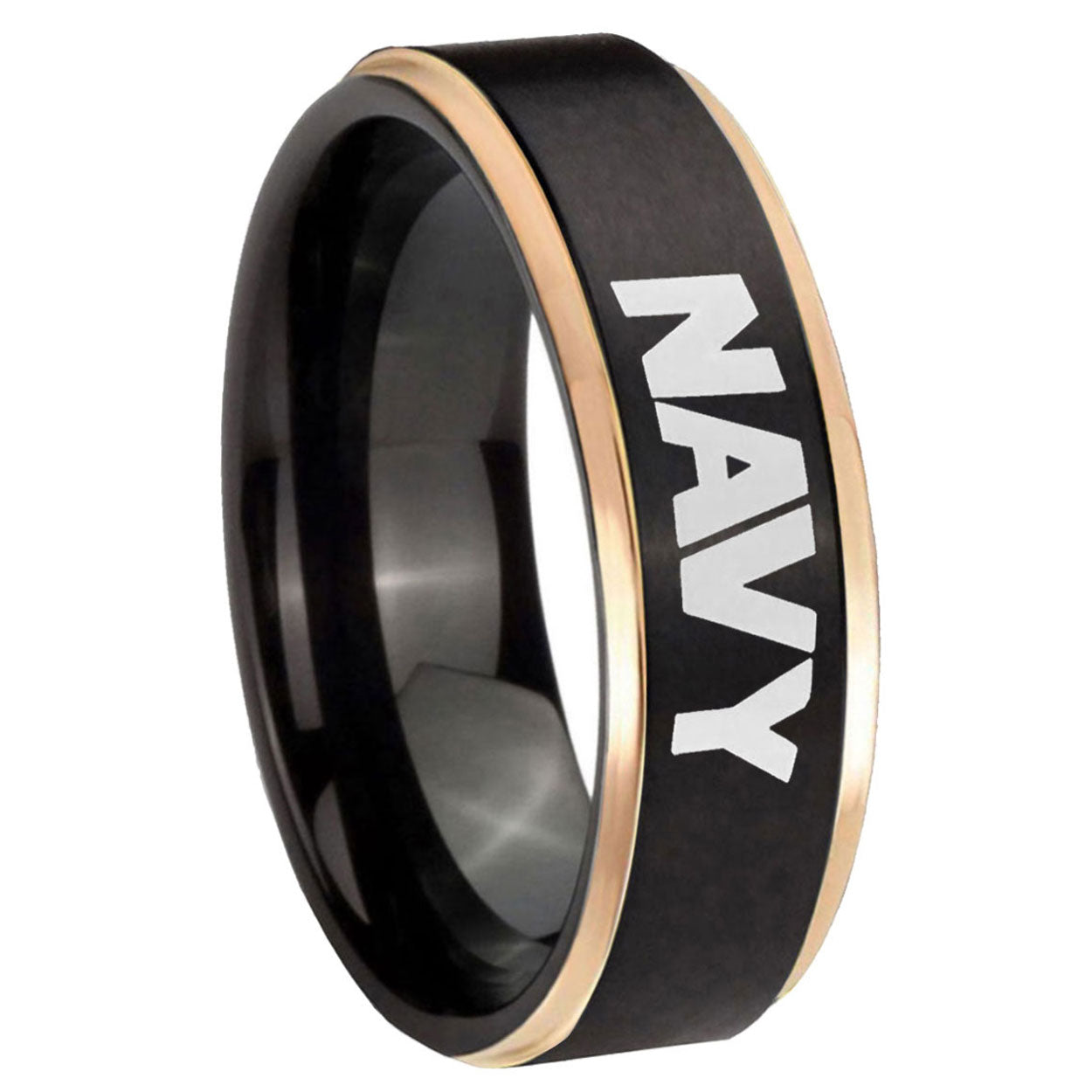 Intruding 6, 8mm Navy Rose Gold Step Edge Black Tungsten Carbide Men's Wedding Band . Offer in both 6mm and 8mm band width black plated finished from size 6 to 14