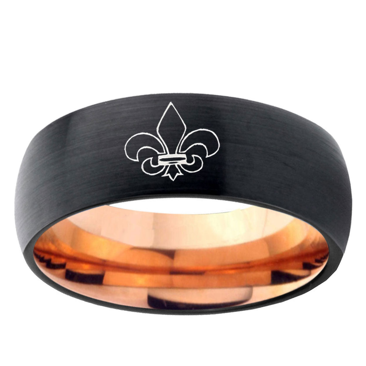 Customize the 10mm Fleur-De-Lis Dome Tungsten Rose Gold Custom Ring for Men. This rose gold tungsten dome ring with Fleur-De-Lis design is perfect for personalization.
