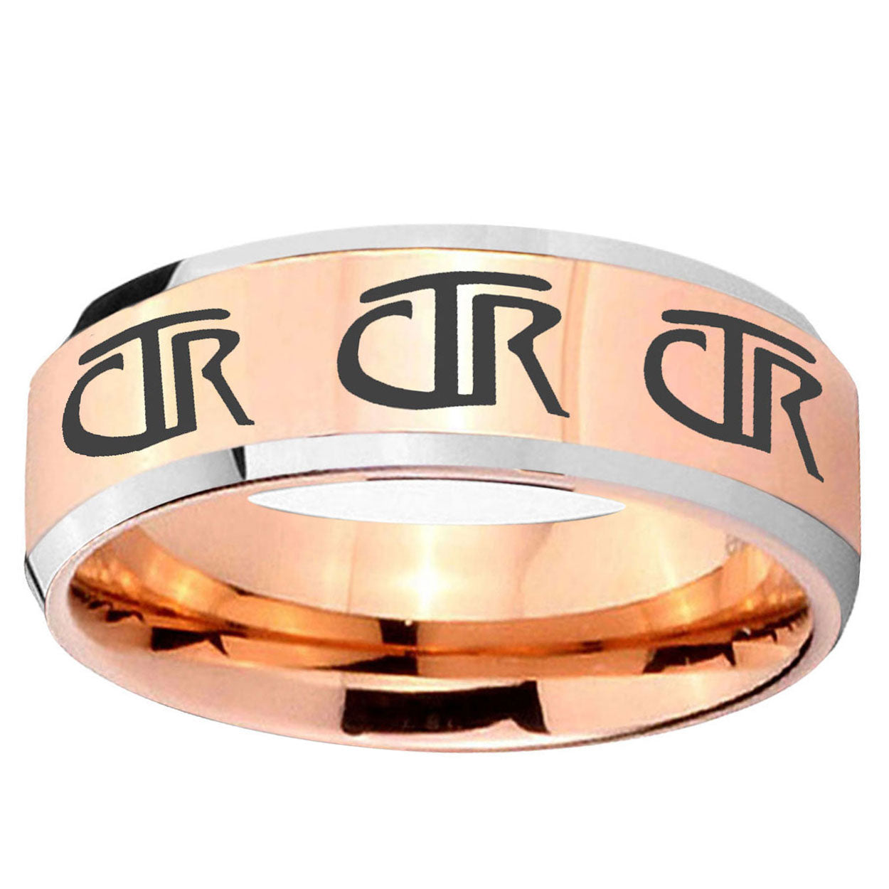 Intruding 5, 8mm Multiple CTR Beveled Edges Rose Gold Tungsten Carbide Mens Ring Engraved . Offer in both 5mm and 8mm band width rose gold two tone finished from size 4 to 14