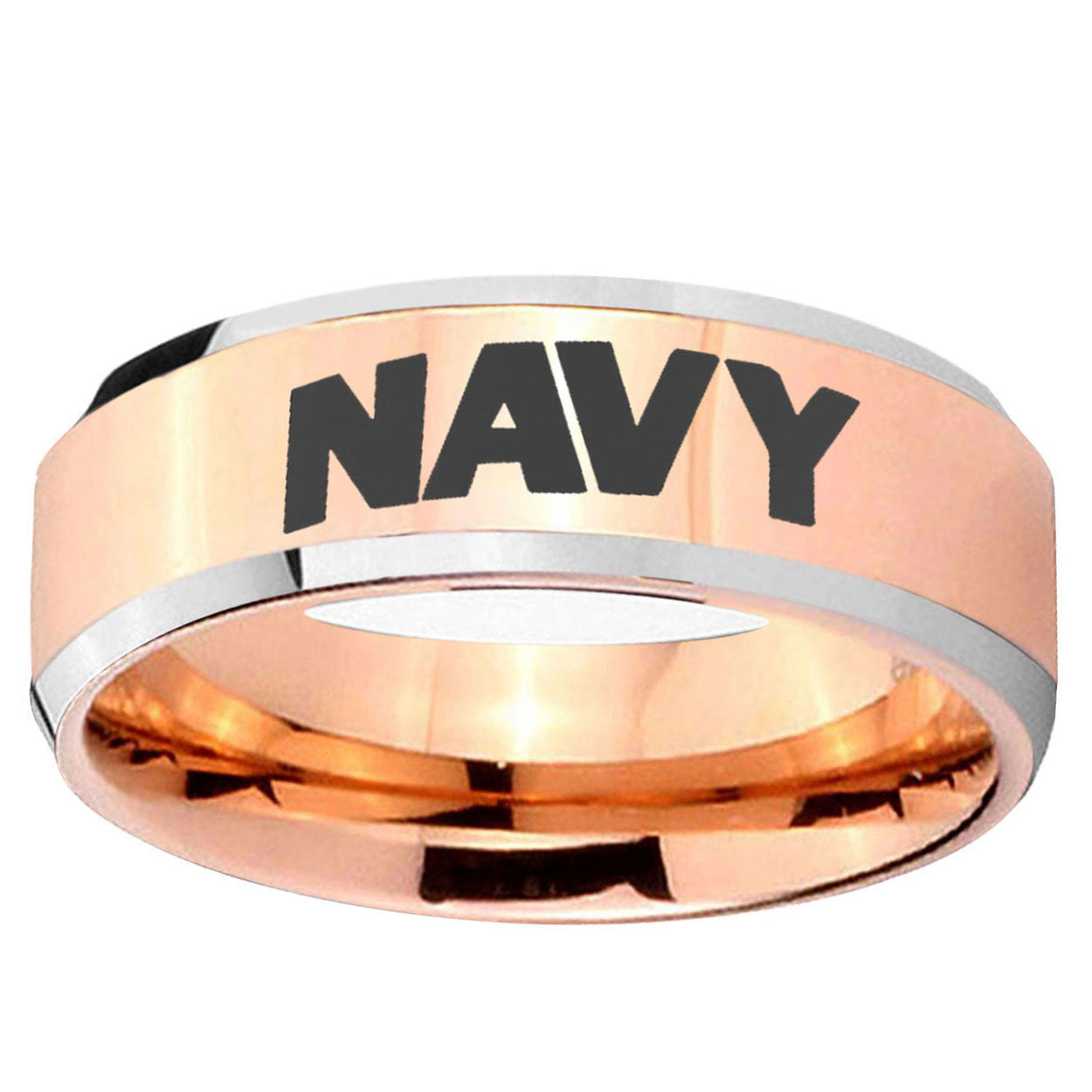 Style the 10mm Navy Beveled Edges Rose Gold Tungsten Carbide Rings for Men. This rose gold tungsten ring with Navy design is perfect for men.