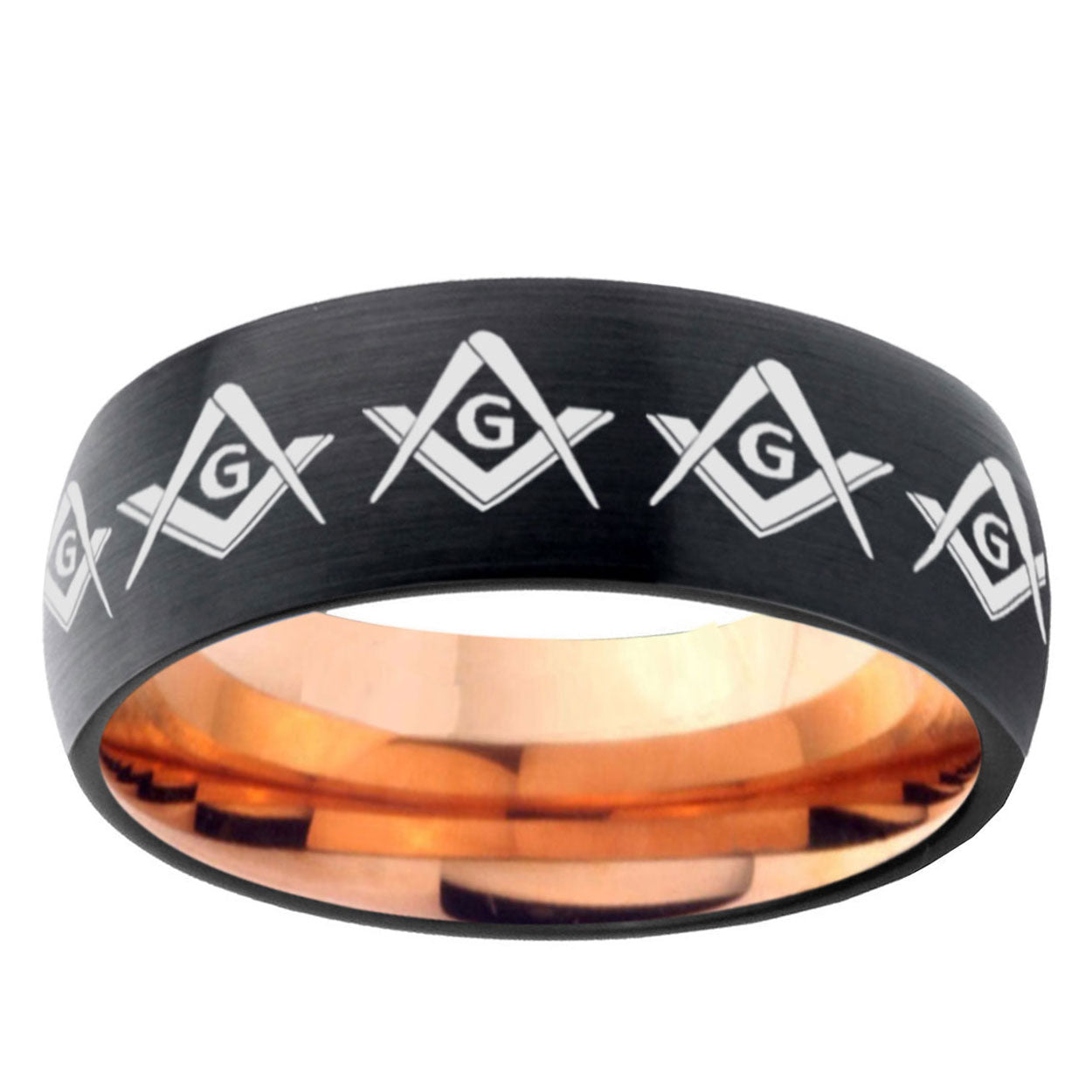 Intruding 5, 8mm Masonic Square and Compass Dome Tungsten Carbide Rose Gold Anniversary Ring . Offer in both 5mm and 8mm band width black and rose gold plated finished from size 4 to 14