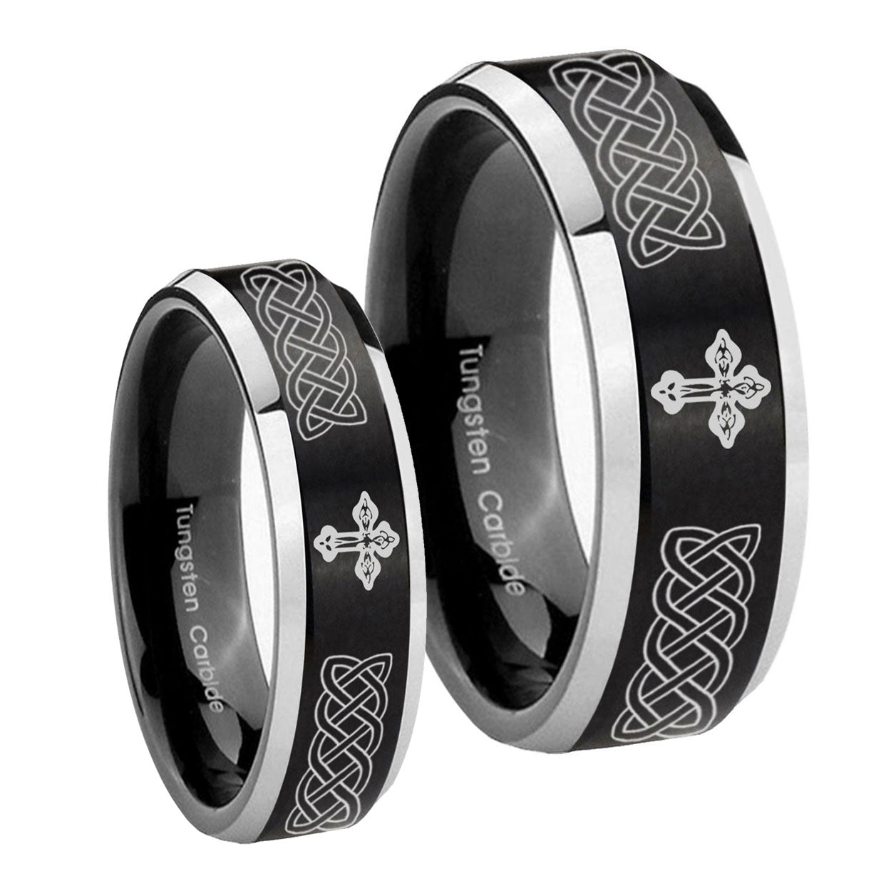 His Hers Celtic Cross Beveled Brush Black 2 Tone Tungsten Men's Band Ring Set