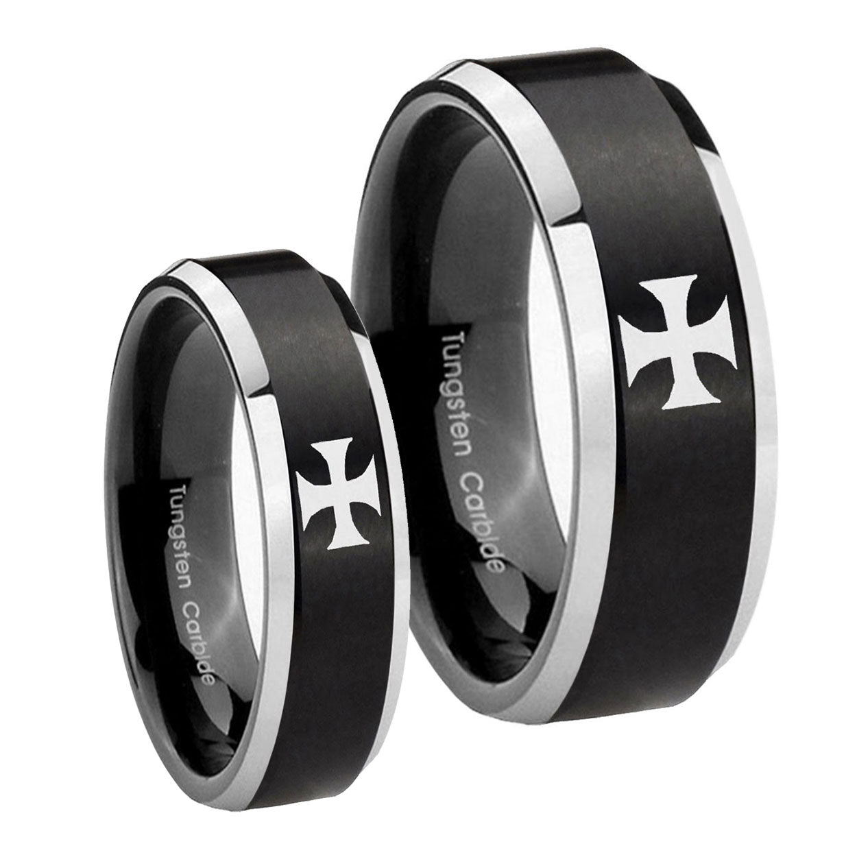 His Hers Maltese Cross Beveled Brush Black 2 Tone Tungsten Mens Band Set