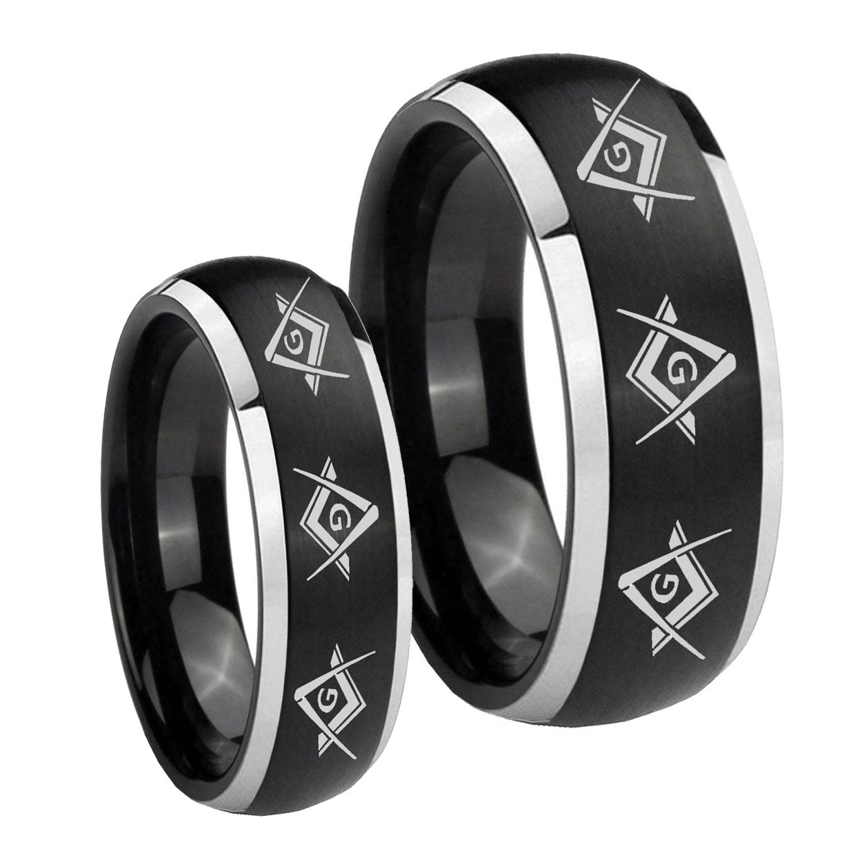 His Hers Master Mason Masonic Dome Brushed Black 2 Tone Tungsten Mens Ring Set