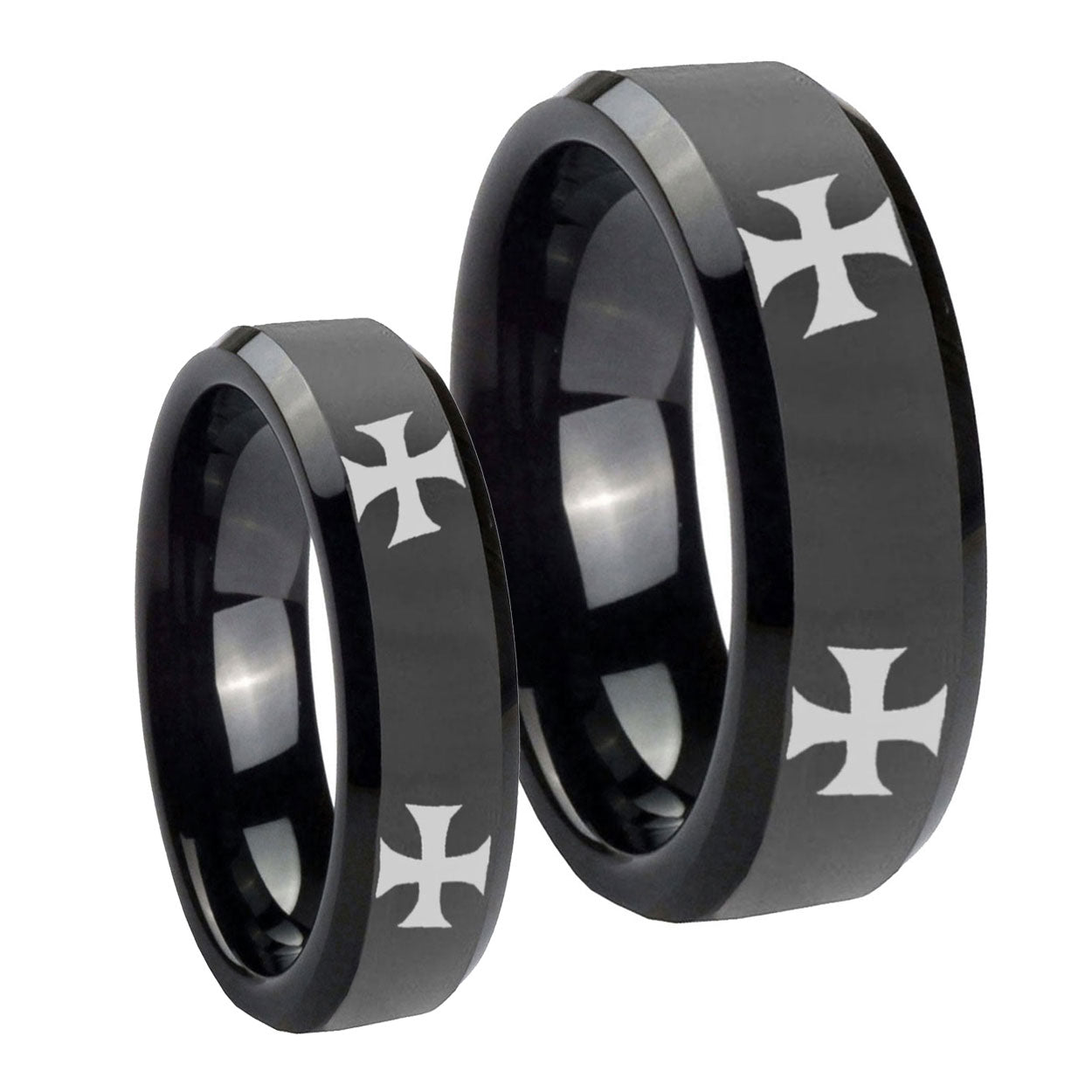 His Hers 4 Maltese Cross Beveled Edges Black Tungsten Promise Ring Set
