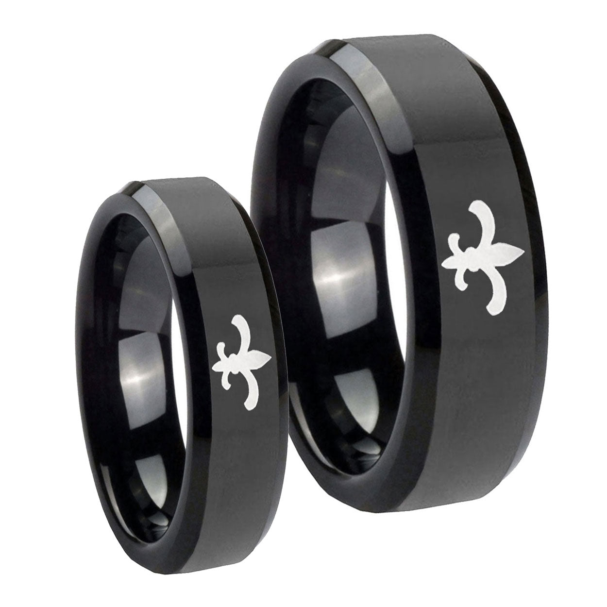 His Hers Fleur De Lis Beveled Edges Black Tungsten Mens Anniversary Ring Set