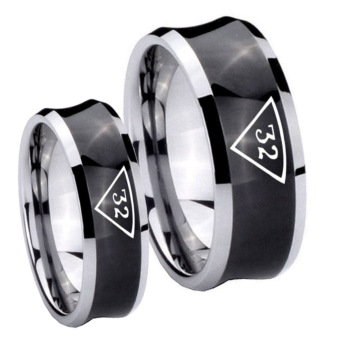Bride and Groom Masonic 32 Triangle Freemason Concave Black Tungsten Carbide Bands Ring Set