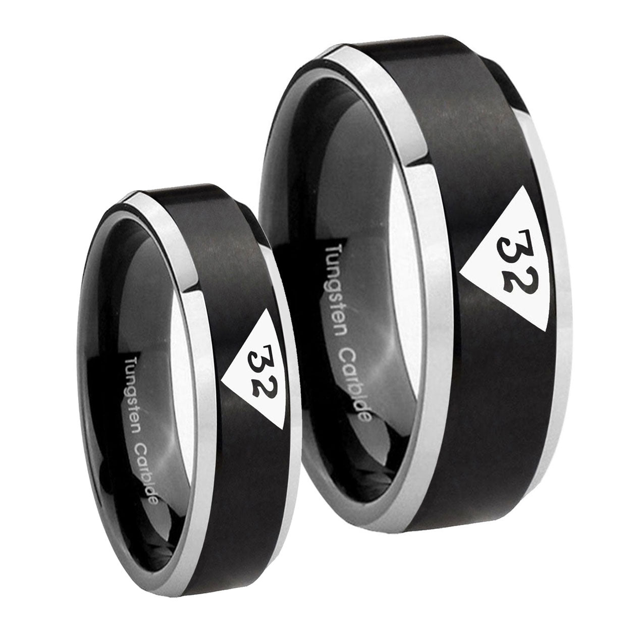His Hers Masonic 32 Triangle Design Freemason Beveled Edges Brush Black 2 Tone Tungsten Engagement Ring Set