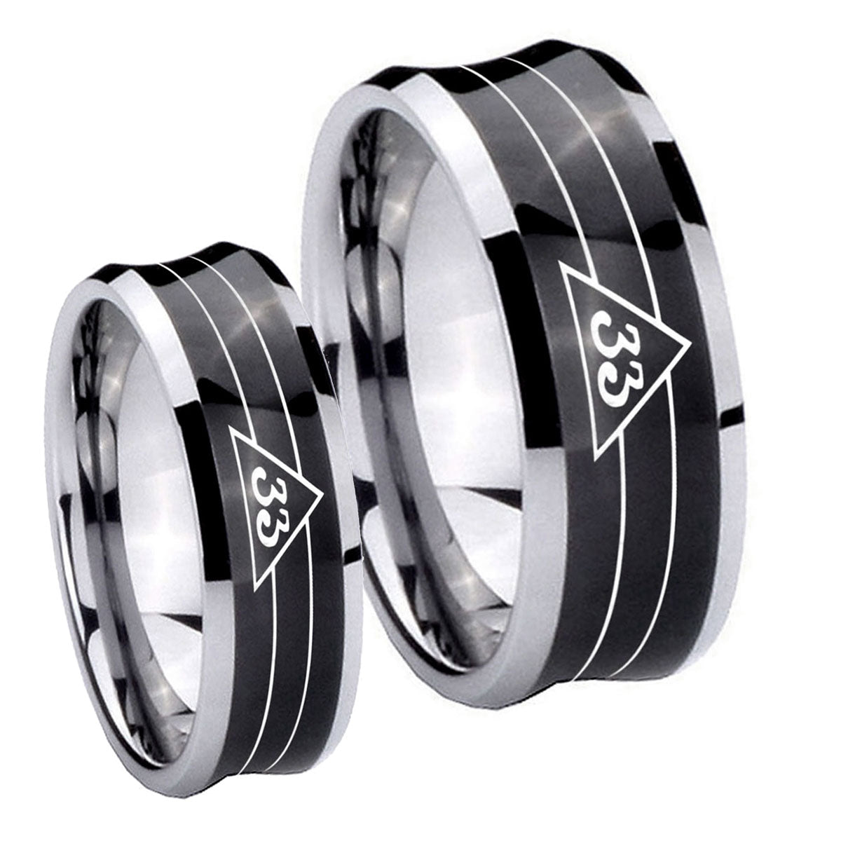 Bride and Groom Masonic 32 Duo Line Freemason Concave Black Tungsten Carbide Bands Ring Set