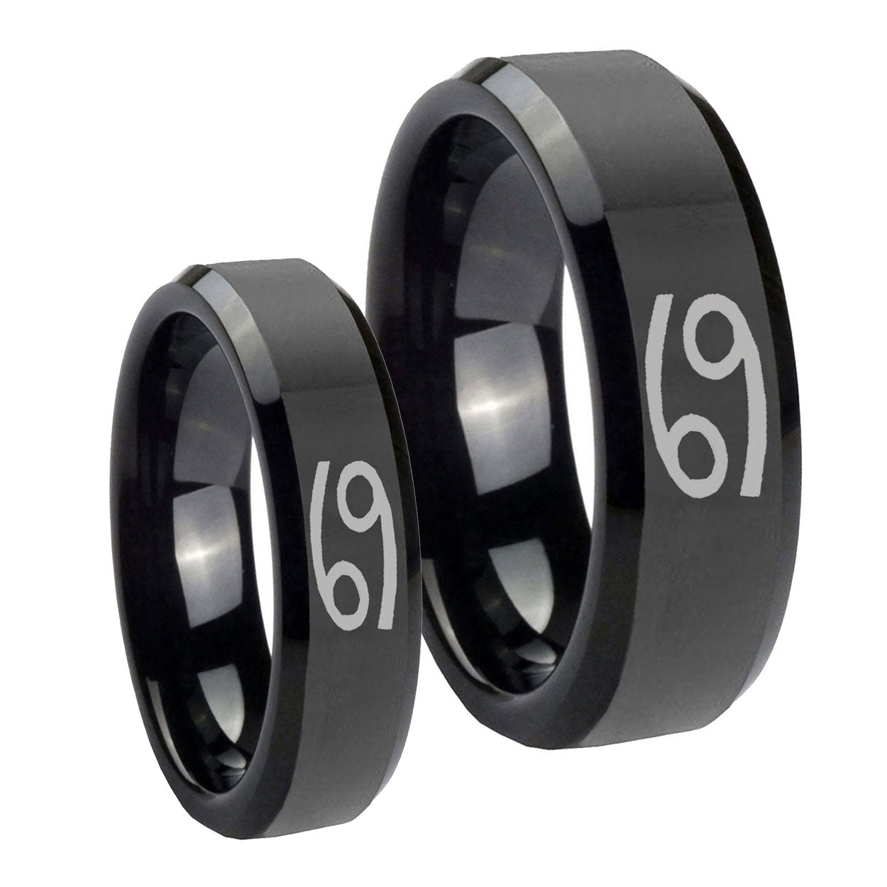 His Hers Cancer Horoscope Beveled Edges Black Tungsten Mens Bands Ring Set