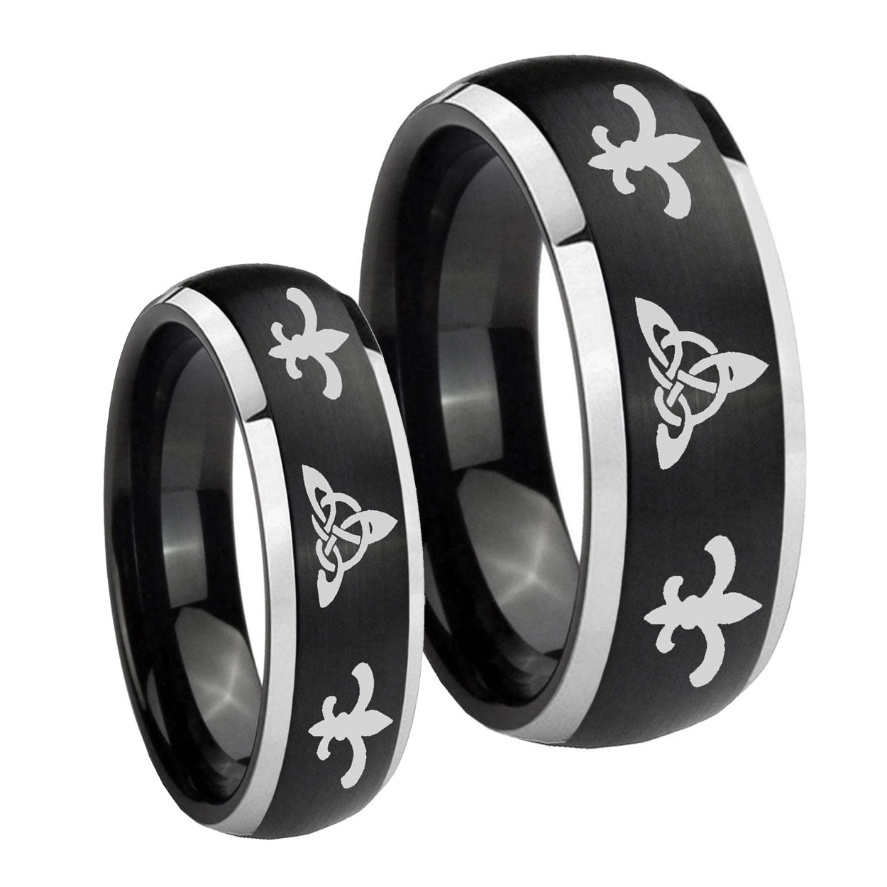 His Hers Celtic Triangle Fleur De Lis Dome Brushed Black 2 Tone Tungsten Engraving Ring Set