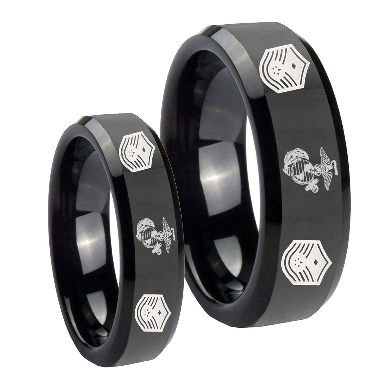 His Hers Marine Chief Master Sergeant Beveled Edges Black Tungsten Men's Band Ring Set