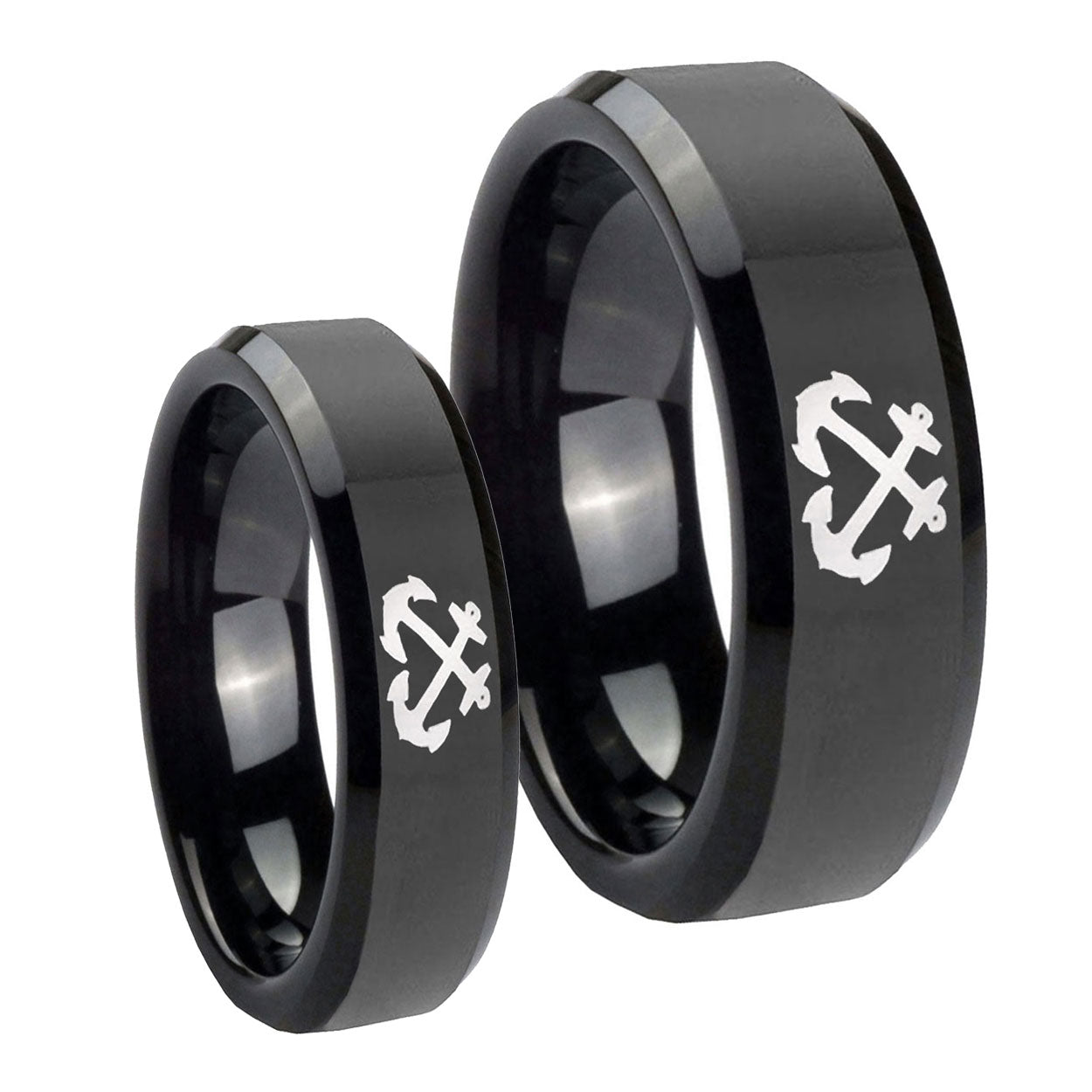 Bride and Groom Anchor Beveled Edges Black Tungsten Rings for Men Set